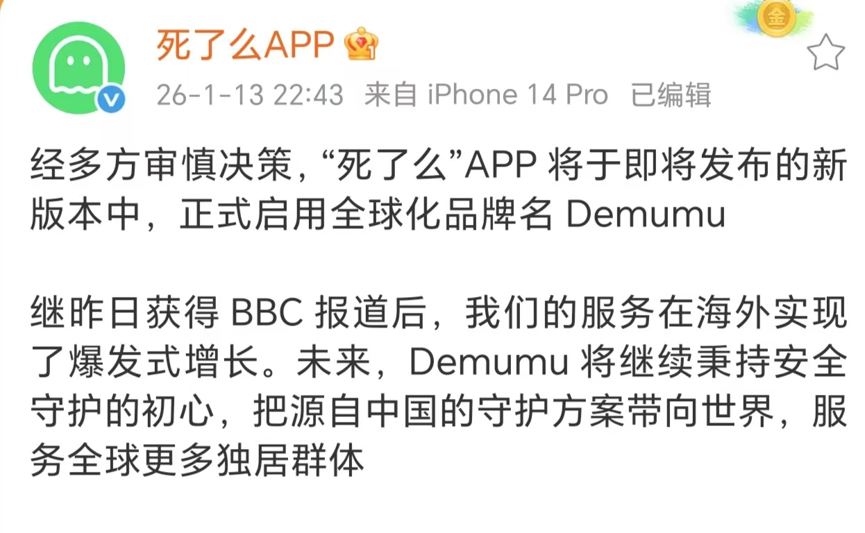 1月13日晚间,死了么APP发布消息称,经团队审慎决策,“死了么”APP将于即将发布的新版本中,正式启用全球化品牌名Demumu。