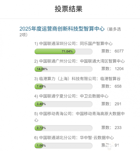 投票结果显示,截至1月14日11时,深圳联通的同乐国产智算中心一骑绝尘,以6077的票数获得比较大的领先优势。