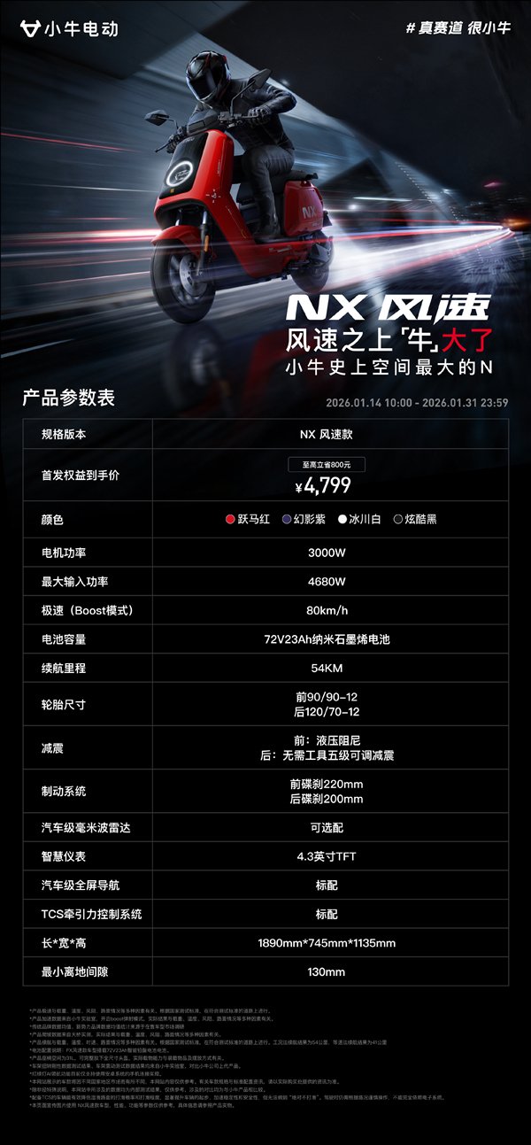 快科技1月14日消息,小牛电动NX风速正式上市,售价4799元起。