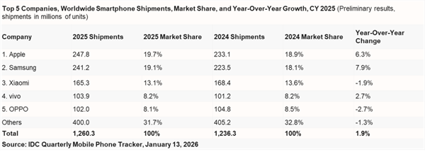 快科技1月14日消息,根据IDC发布的最新报告,2025年全球智能手机市场实现连续第二年增长,全年出货量达12.6亿部,同比增1.9%。