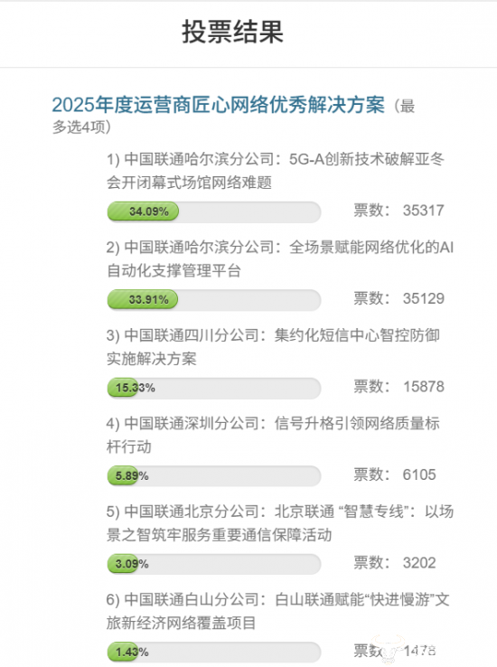 投票结果显示,截至1月14日16时,哈尔滨联通占据榜单前两名,其“5G-A创新技术破解亚冬会开闭幕式场馆网络难题”及“全场景赋能网络优化的AI自动化支撑管理平台”分别获得35317票、35129票,位列第一、第二名。