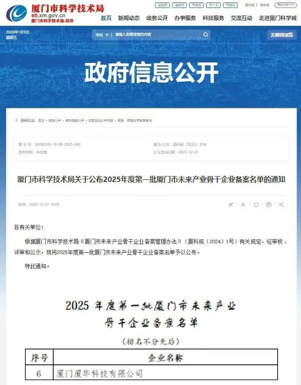近日,厦门市科技局正式公布了“2025年度第一批厦门市未来产业骨干企业”名单。凭借在新型显示、新一代人工智能领域的深厚技术积淀与卓越的创新表现,厦门厦华科技有限公司(下文称“PRIMA厦华”)在众多厦门企业中脱颖而出,成功获得官方备案!这一殊荣,不仅是对PRIMA厦华技术实力的官方“盖章”,更是对我们在未来产业赛道中领跑地位的深度认可。