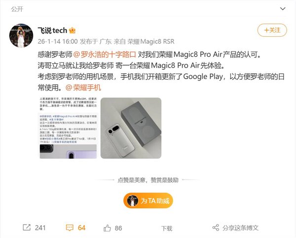 对此,博主飞说tech表示,感谢罗老师对我们荣耀Magic8 Pro Air产品的认可,涛哥立马就让我给罗老师寄一台荣耀Magic8 Pro Air体验,考虑到罗老师的用机场景,手机我们开箱更新了Google Play,方便罗老师日常使用。