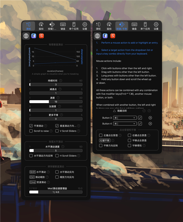 我自己在用的是 BetterMouse,付费但一次性买断,可以自定义配置滚动时长、方向、加速度,还支持 MX Master 系列的滚轮缩放、滚动、动作绑定,甚至每个应用可以独立设置滚动和按键映射。