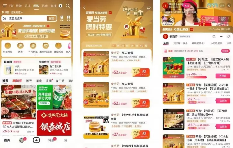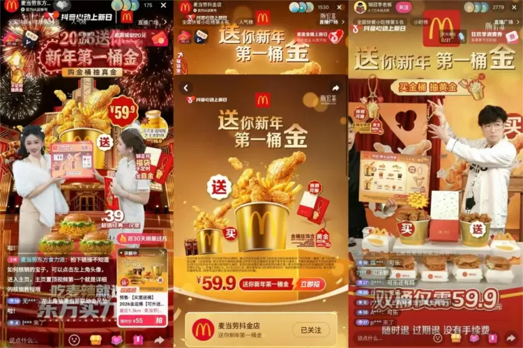 在此次新年大促中,麦当劳特别打造了独具特色的“好运”主题场景,巧妙融合新年的喜庆氛围与美食的诱人体验。主播团队以沉浸式的视觉呈现带领观众感受新年气息,不仅在镜头前详细解读福利细节,更通过吸睛互动环节,极大增强了直播的趣味性与观众参与感。作为新年的重磅福利,“第一桶金”套餐在直播间限时发售,并可在线下门店同步享受,真正实现了“线上线下同享”的用餐体验,精准满足了消费者在新年期间多元化、高品质的用餐需求。