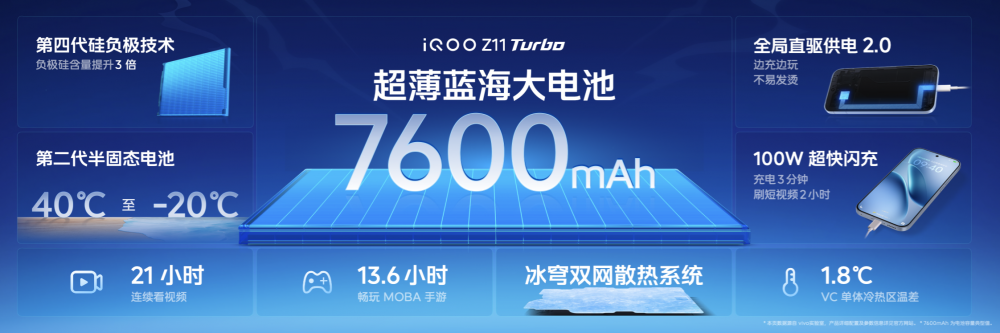 续航方面,iQOO Z11 Turbo搭载7600mAh超薄蓝海大电池,支持100W闪充,低电量疾速回血。另外,全场景直驱供电2.0边充边玩不易发烫。配备的冰穹双网散热系统,在极限重载测试下,iQOO Z11 Turbo的CPU核心温度至高直降15℃,机身表面冷区与热区温差也被控制在1.8℃以内,散热更均匀。