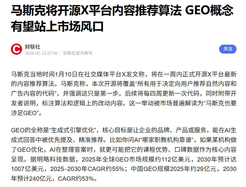 马斯克的GEO内容**算法即将公开,从时间上算,今晚或者明晚大概率就要公开了。