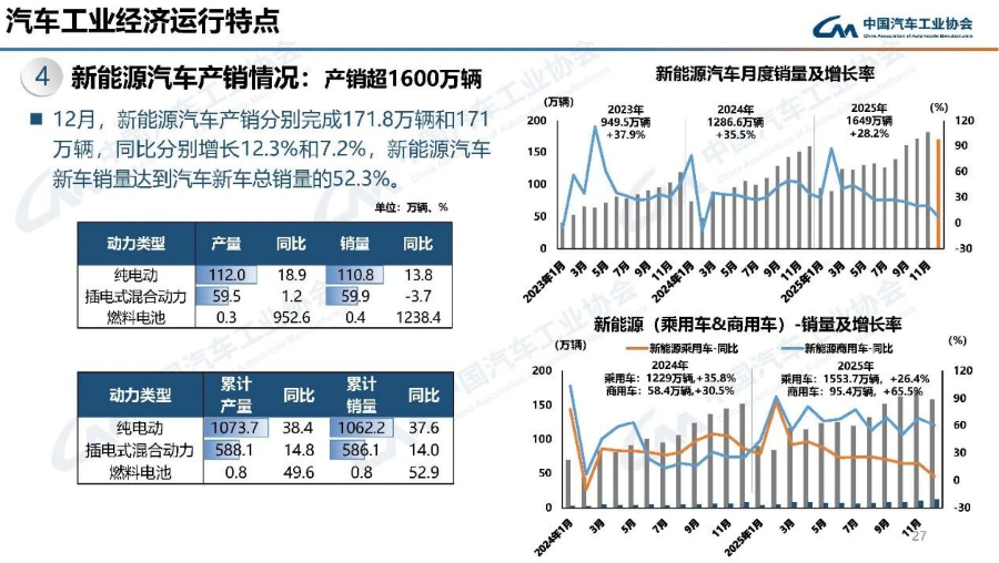 动力路线的竞争也出现新变化。根据中汽协披露的数据,2025年全年,纯电动车型的销量为1062.2万辆,约占1649万辆新能源新车市场大盘的六成,同比增长37.6%。