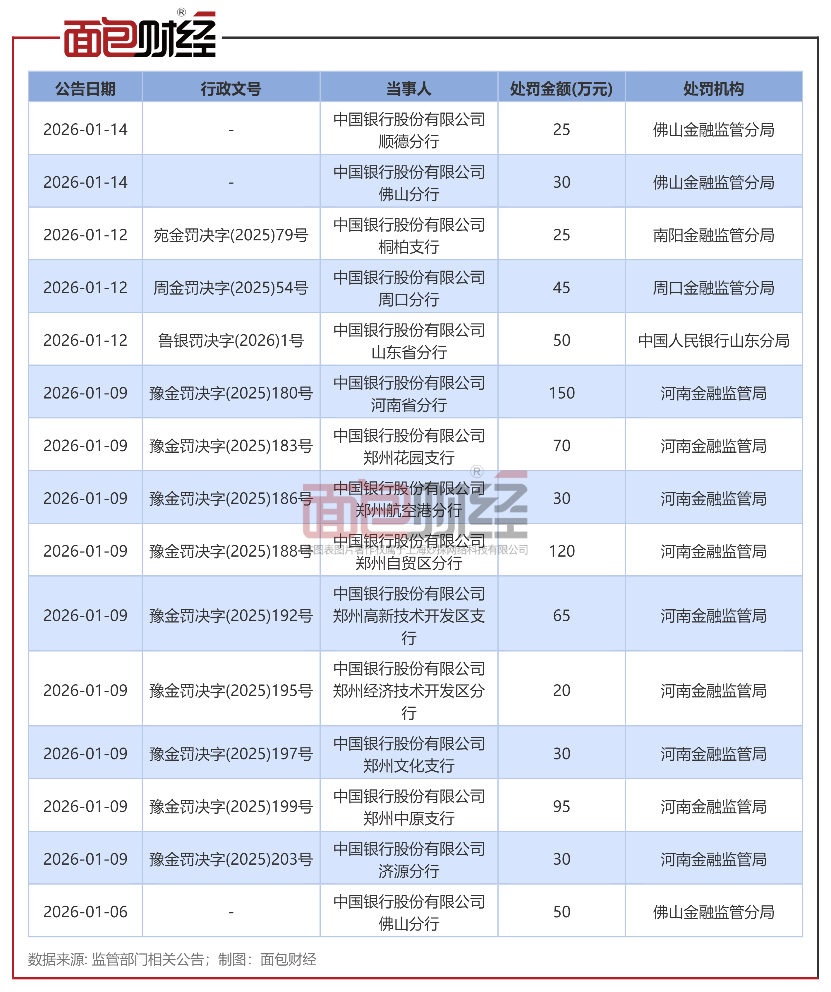 2026年1月9日,中国银行有9家分支机构被处罚,其中有两张罚单超百万。河南金融监管局行政处罚信息公示列表显示,中国银行股份有限公司河南省分行由于贷后管理不到位;违反监管规定放松对借款人还款能力真实性审查要求;贷款“三查”不尽职,违规发放个人贷款;数据质量管理不审慎,被罚款150万元。