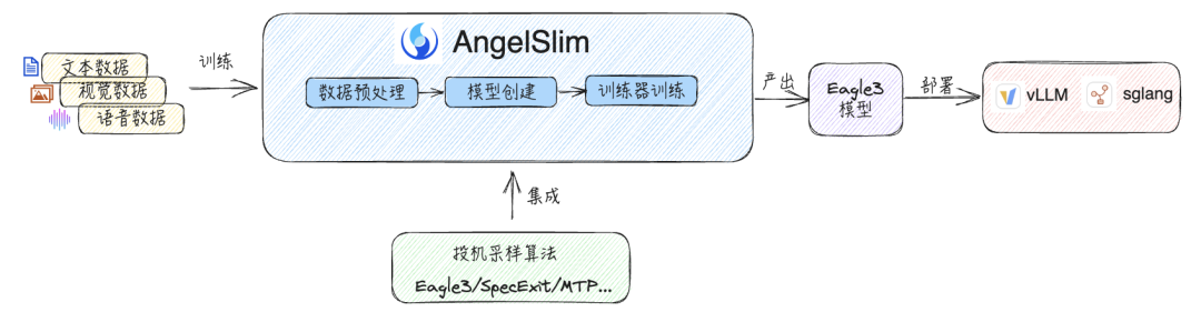 AngelSlim 以 “Eagle3 训练即部署” 为设计核心,提供从数据处理、模型封装到投机采样算法训练的完整链路,帮助开发在不侵入现有模型结构的前提下,显著降低推理时延与计算成本,各模态、各类大模型加速可达 1.4-1.9 倍。