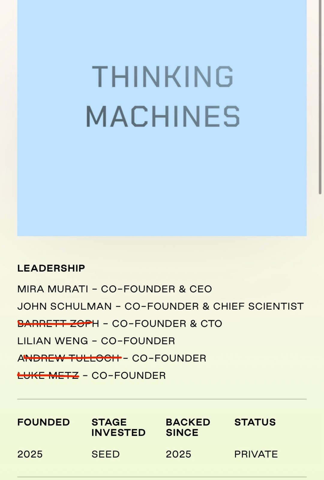 昨天,我们报道了前 OpenAI CTO Mira Murati 创办的 Thinking Machines Lab 出现重大人事变动的消息:联合创始人兼 CTO Barret Zoph 被解雇,另一位联创 Luke Metz 以及创始团队成员 Sam Schoenholz 也一起离开,三人一起回归 OpenAI。