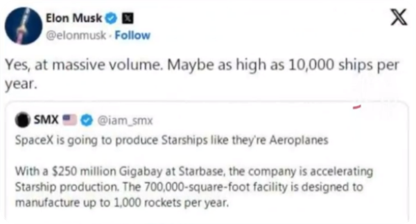 不仅如此,马斯克还进一步透露“数量巨大,可能每年多达1万艘星舰”这一消息。