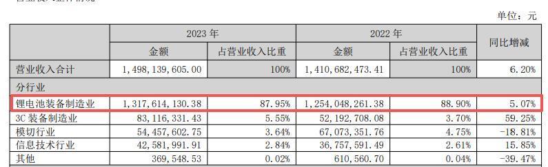 作为锂电池自动化设备第一梯队企业,超业精密助力福能东方从3C自动化向新能源装备转型,适应新能源汽车、储能等新兴市场需求。体现在业绩方面,在超业精密的加持下2023年福能东方实现营收14.98亿元,净利润0.70亿元,扭亏为盈。其中,锂电池装备制造业占比高达87.95%。可以认为,超业精密将福能东方拖出了亏损的泥淖。