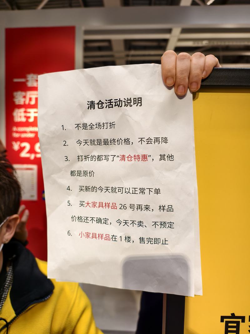 店里高峰时客人结账需要排队约2小时。受访者供图新京报贝壳财经讯(记者俞金旻)1月15日至2月1日,作为宜家中国宣布即将关闭的7家门店之一,宜家上海宝山商场开始“清仓特惠”,800余款小件家具折扣最低至三折。