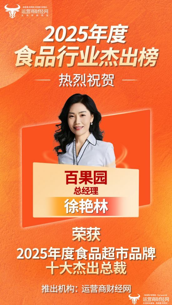 近日,运营商财经网独家打造的“2025年度食品超市品牌十大杰出总裁”正式揭晓,百果园总经理徐艳林成功上榜!