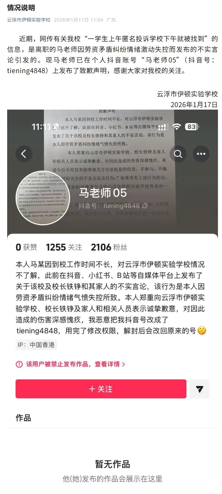 近期,网传有关该校“一学生上午匿名投诉学校下午就被找到”的信息,是离职的马老师因劳资矛盾纠纷情绪激动失控而发布的不实言论引发的。现马老师已在个人抖音账号“马老师05”(抖音号:tiening4848)上发布了致歉声明,感谢大家对学校的关注。