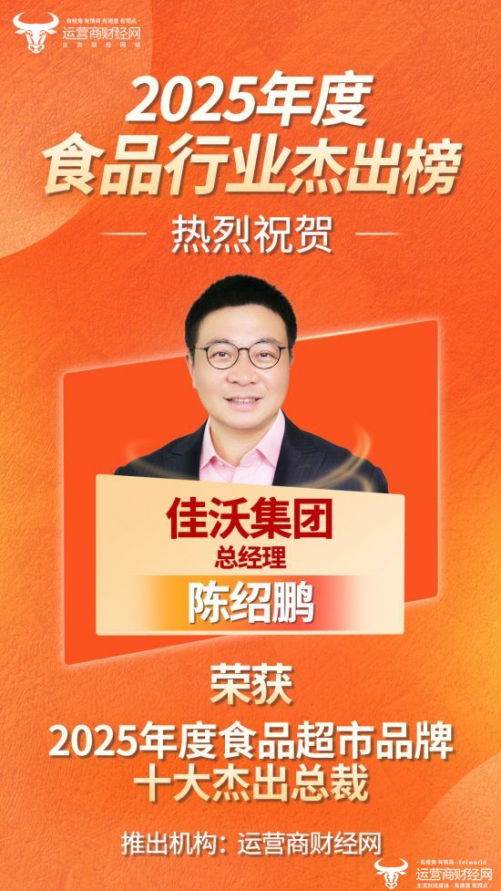 近日,运营商财经网独家打造的“2025年度食品超市品牌十大杰出总裁”正式揭晓,佳沃集团董事长兼总经理陈邵鹏成功上榜!