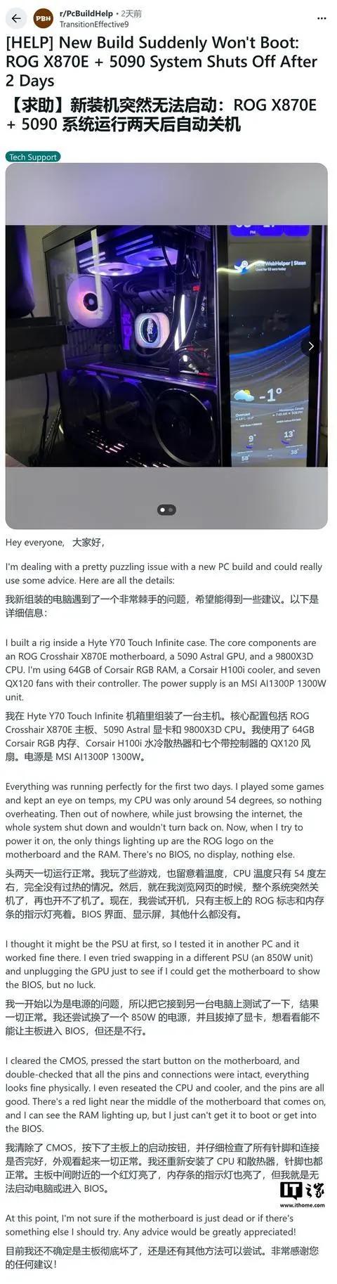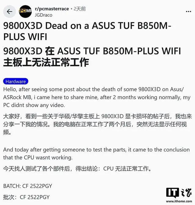 第三起案例则将风险范围扩大到了主流市场。用户 u/JGDraco 报告称,其搭载 ASUS TUF B850M-Plus WiFi 主板的电脑在稳定运行两个月后突然无法启动,经检查确认 Ryzen 7 9800X3D 已经损坏。