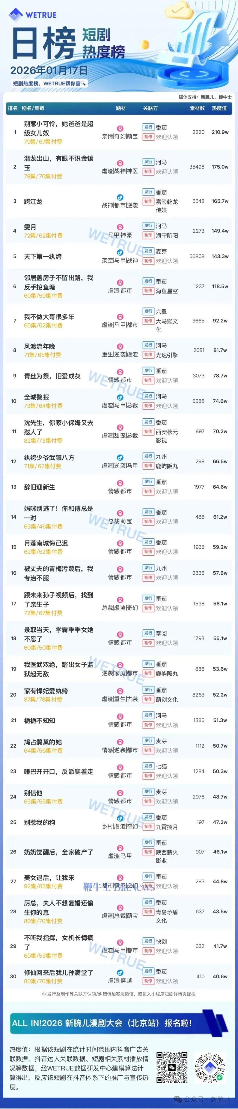 今天发布的是昨天(1月17日)短剧付费大盘日榜,整体大盘热度值为4203万。