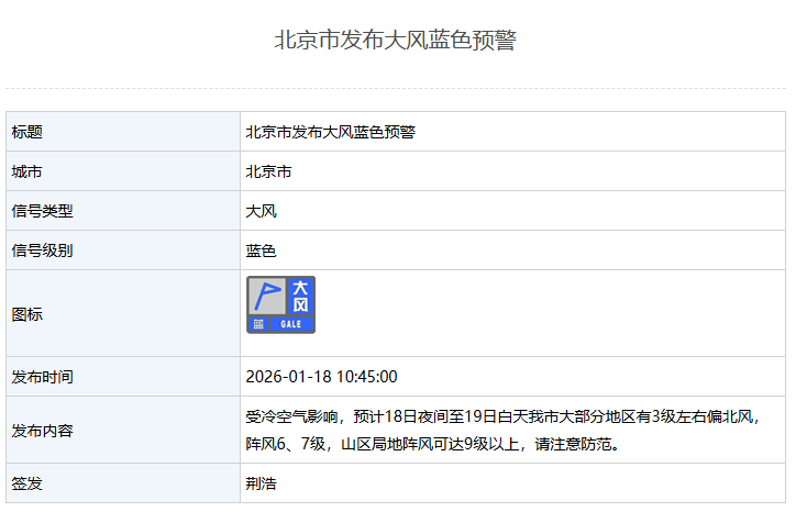 新京报讯 据北京市气象局网站消息,北京市发布大风蓝色预警:受冷空气影响,预计18日夜间至19日白天北京市大部分地区有3级左右偏北风,阵风6、7级,山区局地阵风可达9级以上,请注意防范。