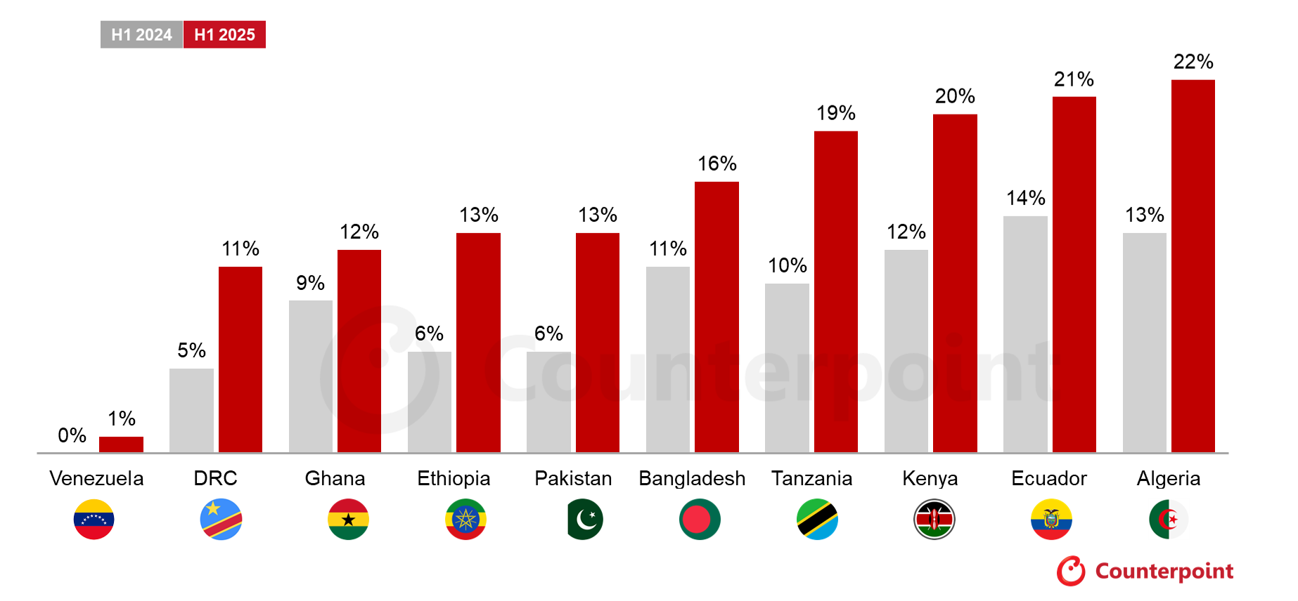 根据Counterpoint的市场监测服务,5G智能手机已经成为主流,占2025年上半年全球智能手机总出货量的71%。它们在发达市场和新兴市场的渗透率都在迅速增长,这主要是由于消费者需求不断增长、价格实惠的设备和更快的5G网络推出。然而,一些国家的智能手机出货量中5G份额的增长仍然非常缓慢,远远落后于全球平均水平。2025年上半年,排名后10位国家的5G平均份额仅为15%。由于基础设施薄弱、投资不足和可负担性障碍,数字鸿沟在这些国家持续存在。