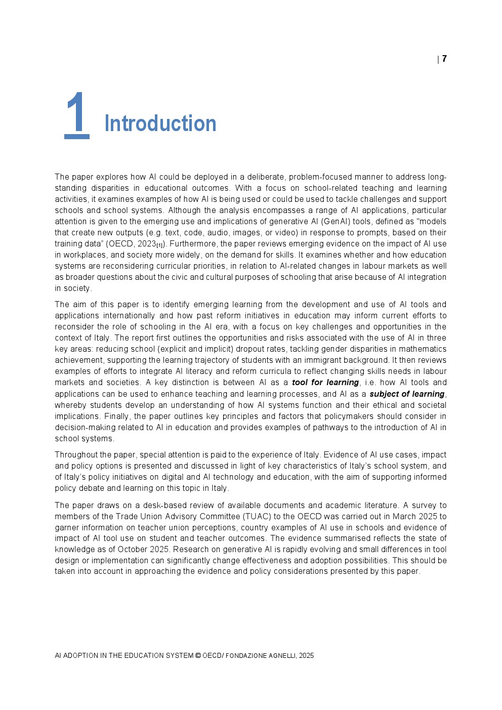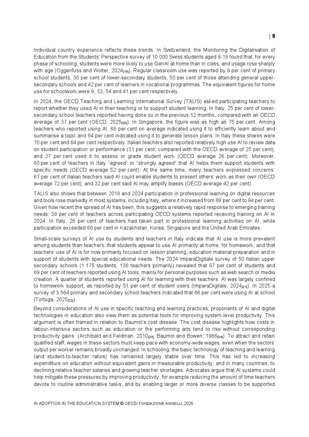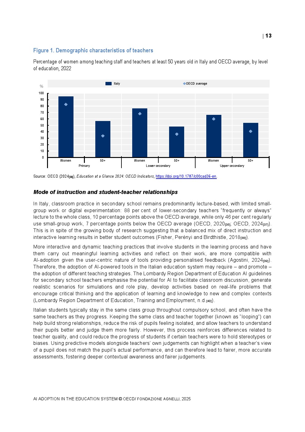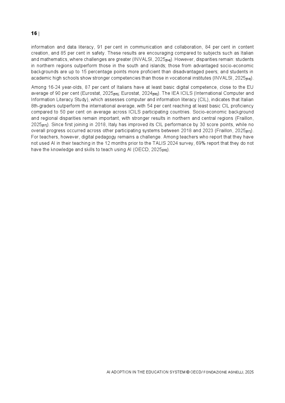 教师端的采用速度相对谨慎。2024年TALIS调查显示,OECD国家平均37%的初中教师在过去一年中使用过AI,而意大利仅为25%,显著低于新加坡的75%。在具体用途上,68%的教师将AI用于资料整理与知识总结,64%用于生成教案,显示AI更多被视为效率工具而非教学范式的重塑力量。