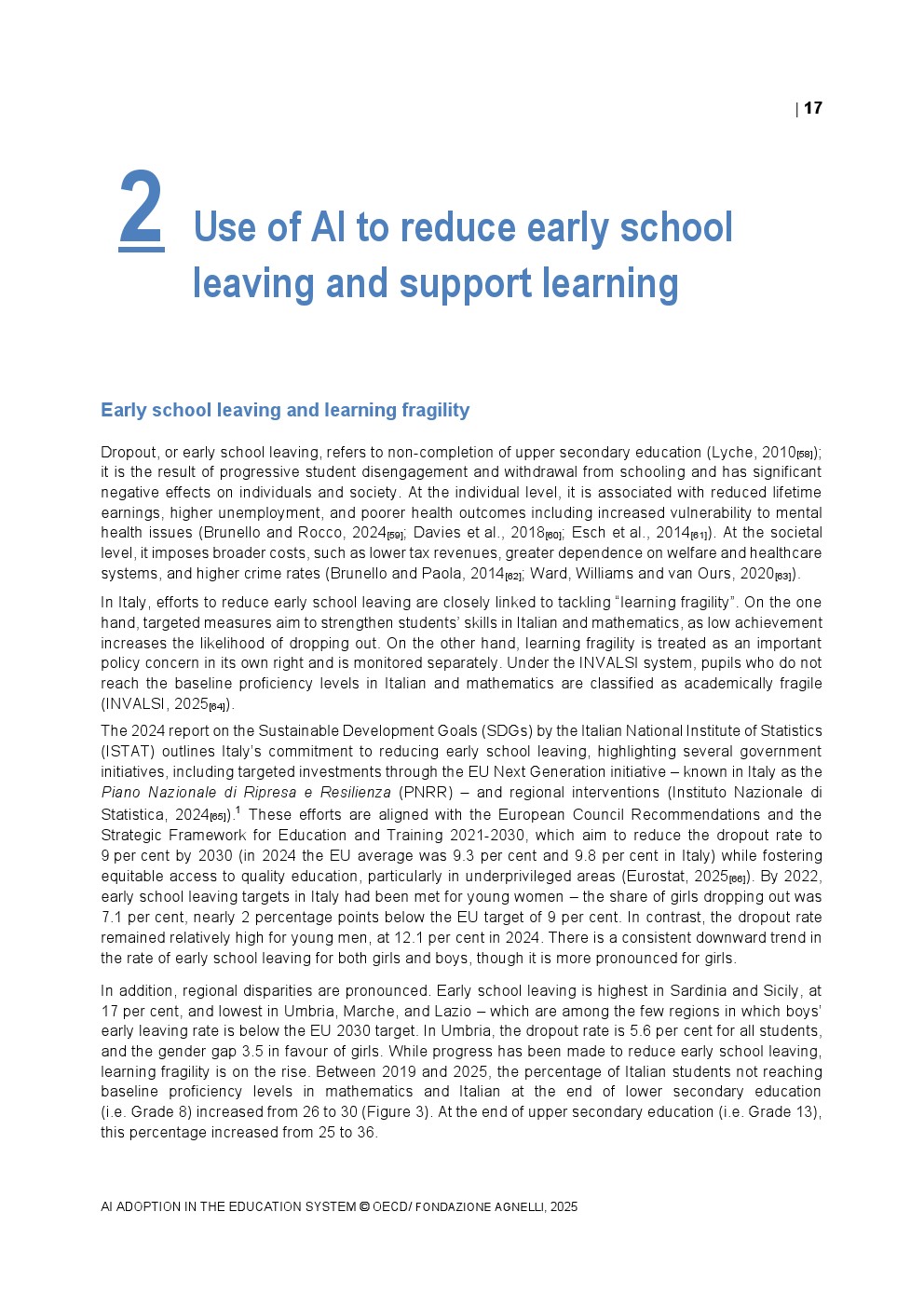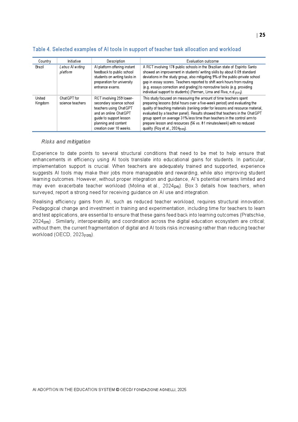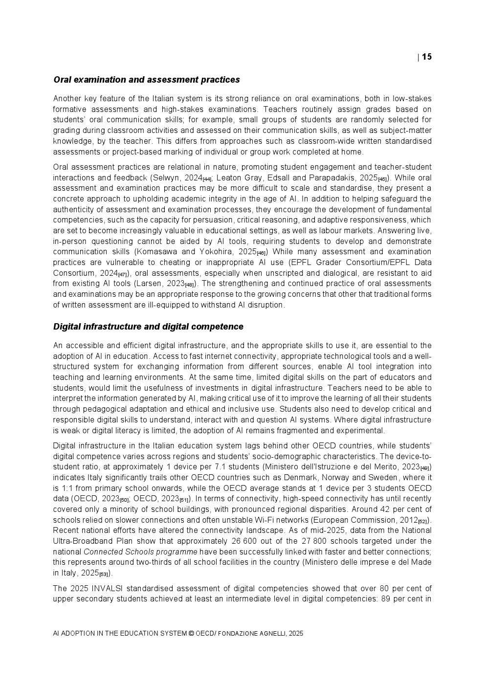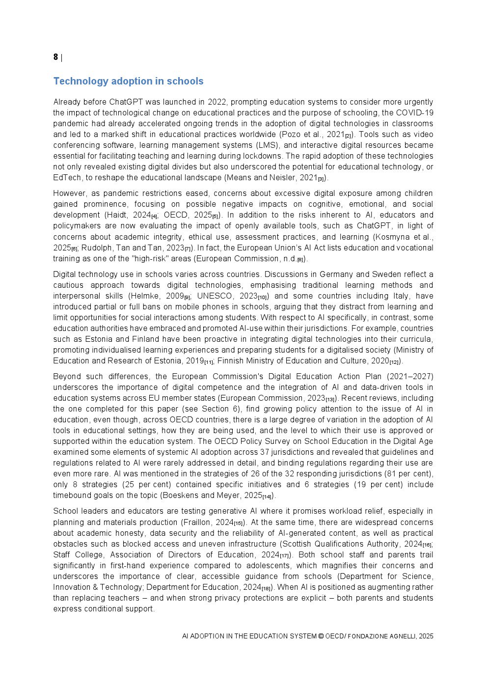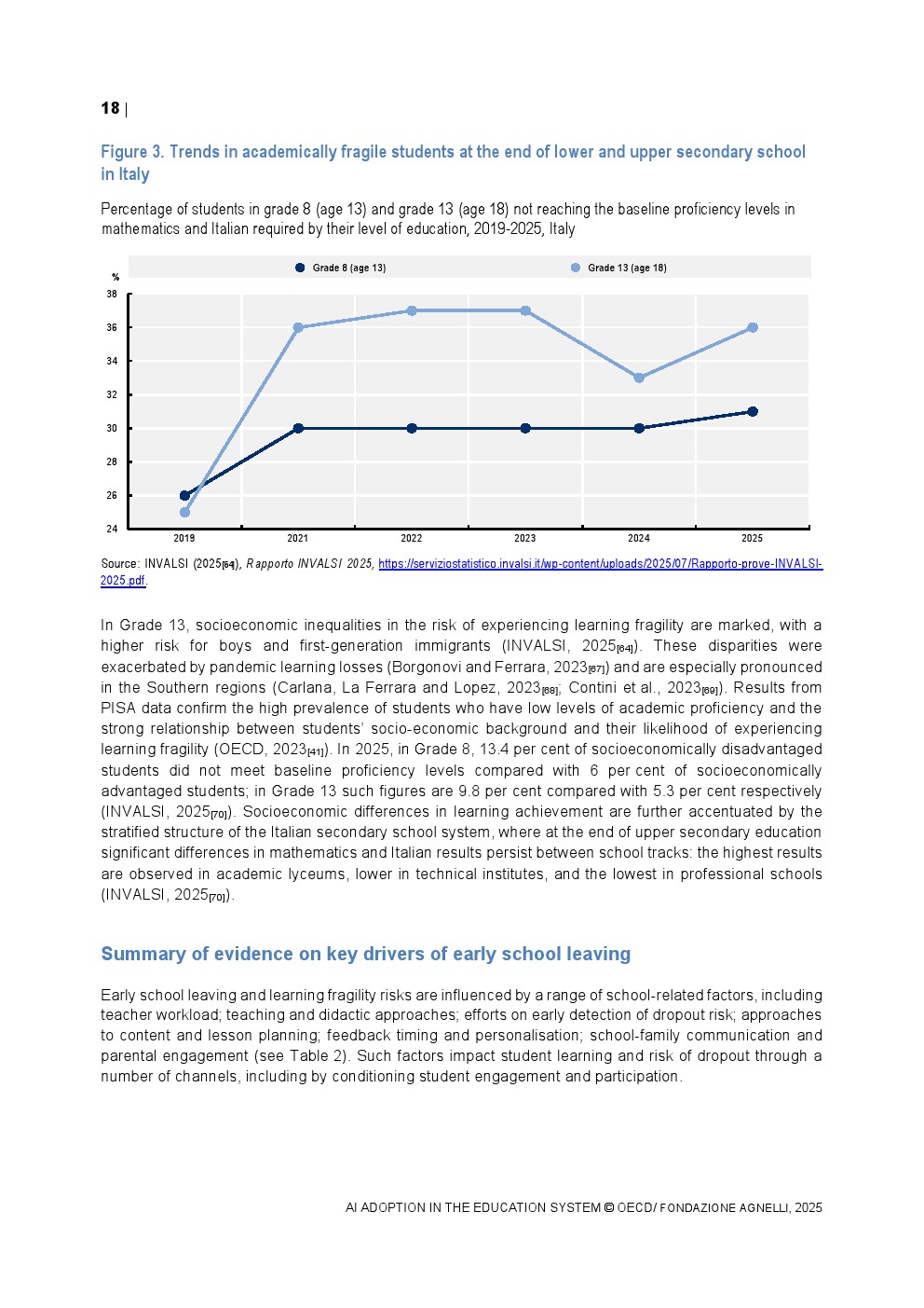 教师端的采用速度相对谨慎。2024年TALIS调查显示,OECD国家平均37%的初中教师在过去一年中使用过AI,而意大利仅为25%,显著低于新加坡的75%。在具体用途上,68%的教师将AI用于资料整理与知识总结,64%用于生成教案,显示AI更多被视为效率工具而非教学范式的重塑力量。