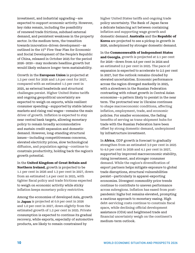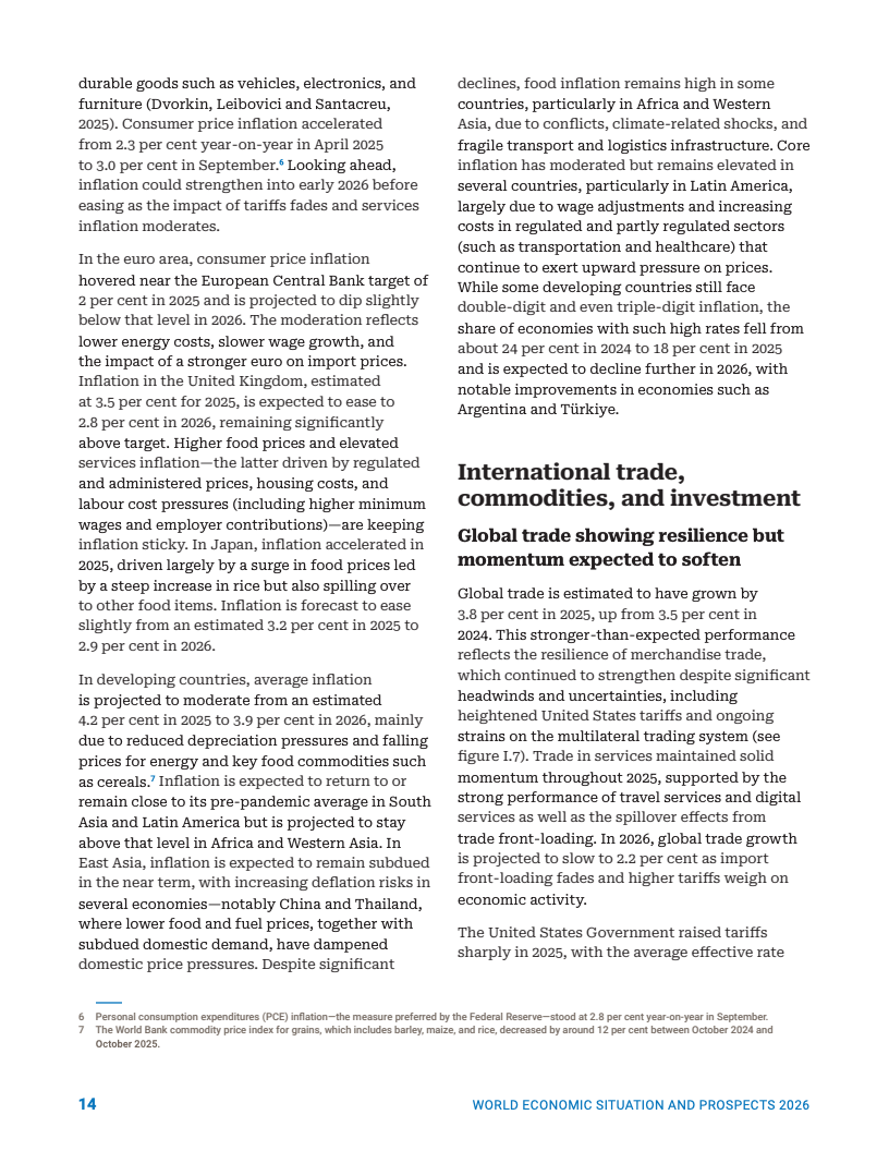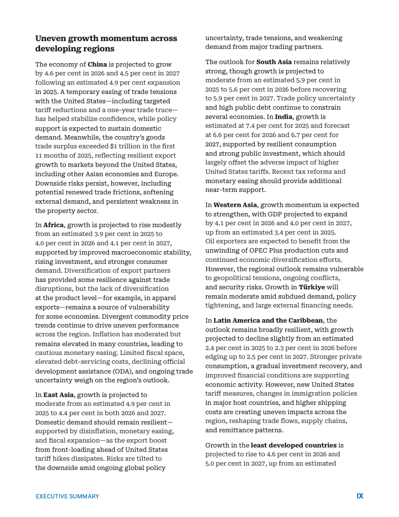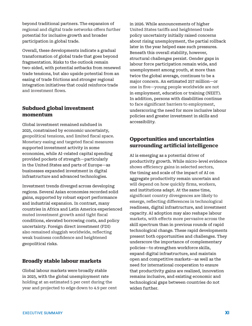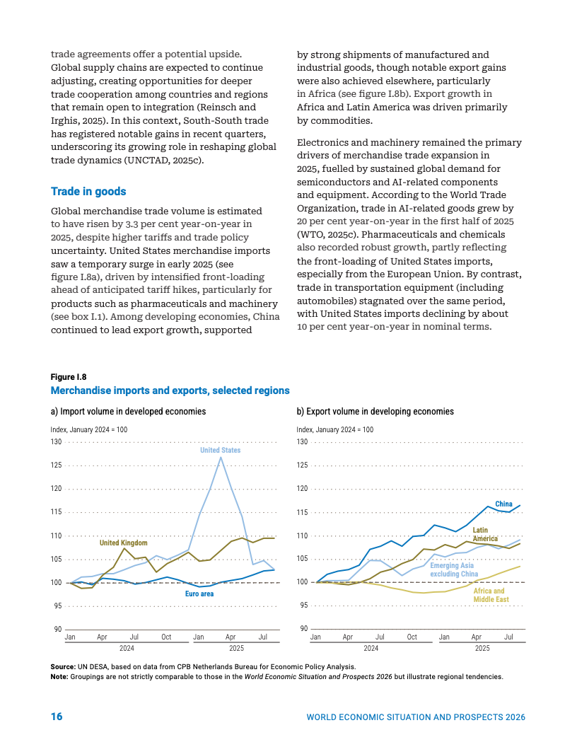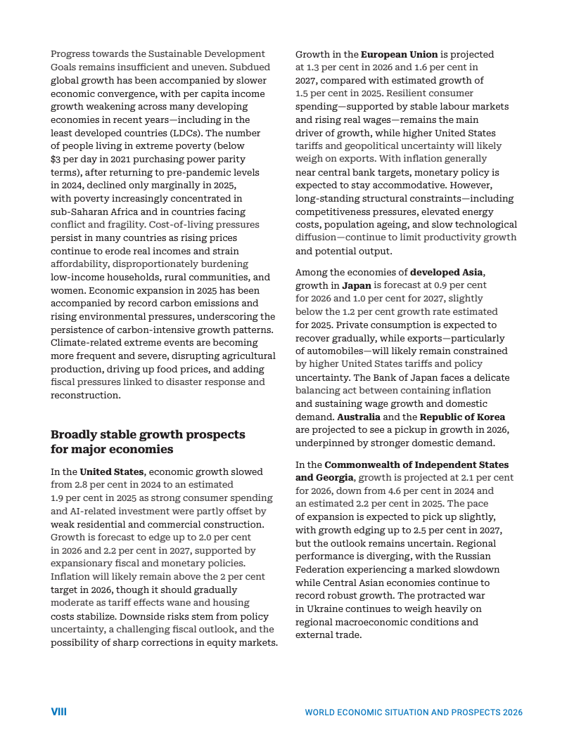 从需求结构看,全球增长更多依赖消费而非投资。报告强调,受融资成本偏高和政策不确定性影响,全球投资持续低迷,仅在部分发达经济体中,人工智能相关投资形成局部亮点。相比之下,居民消费在货币政策逐步宽松和就业市场相对稳定的支撑下保持韧性,但这种支撑呈现明显的区域分化特征,难以形成全球范围的同步拉动效应 。