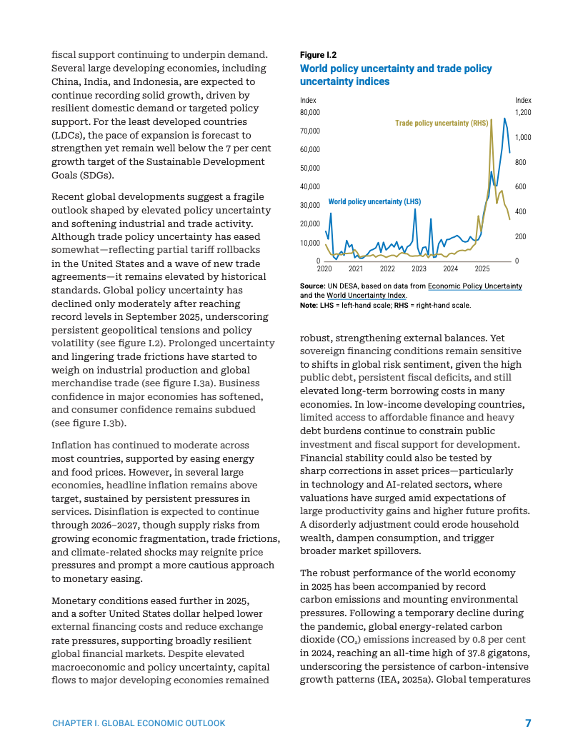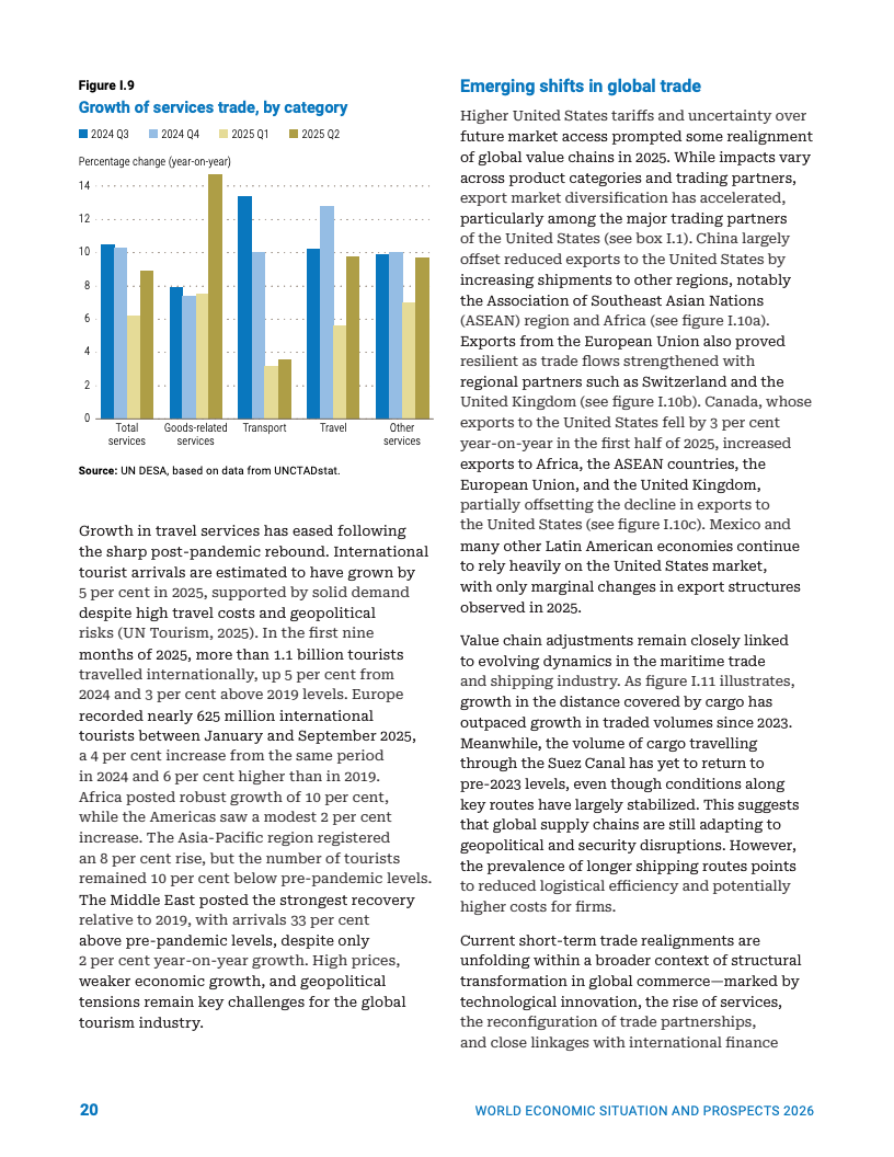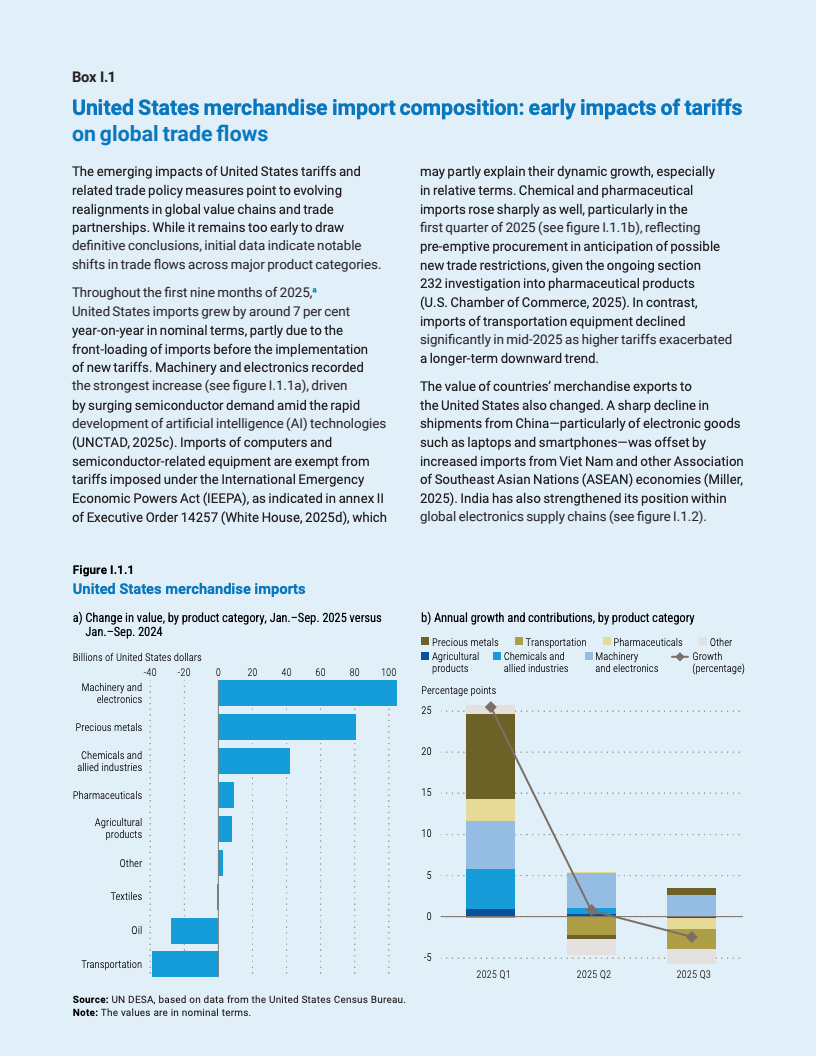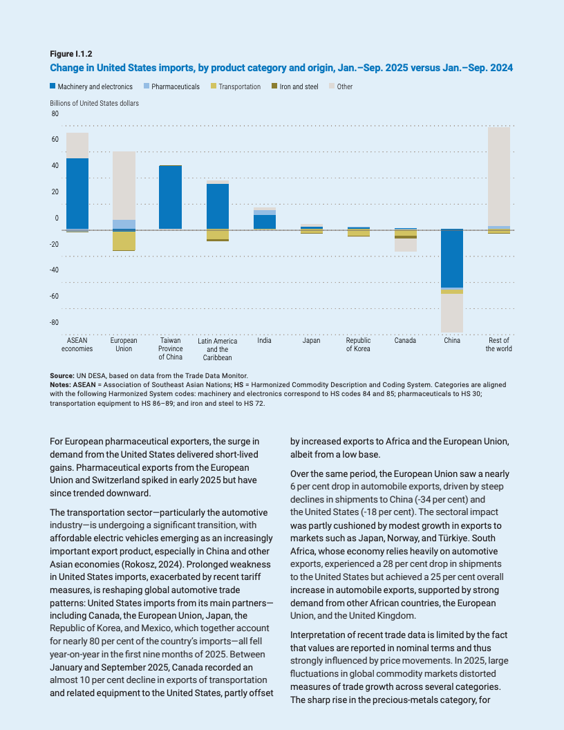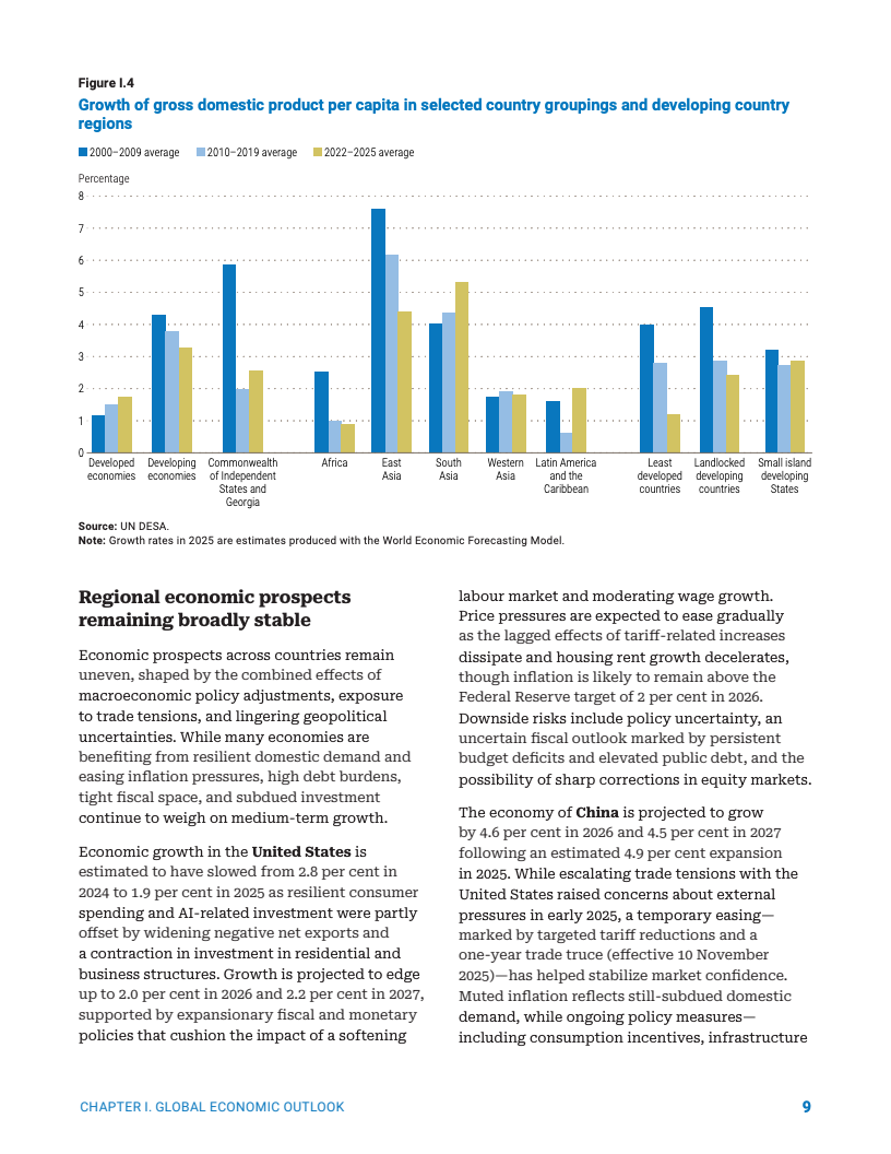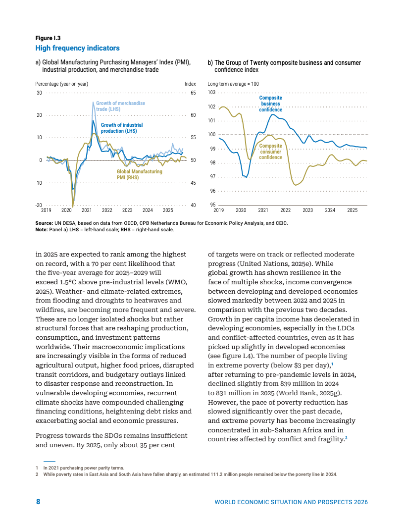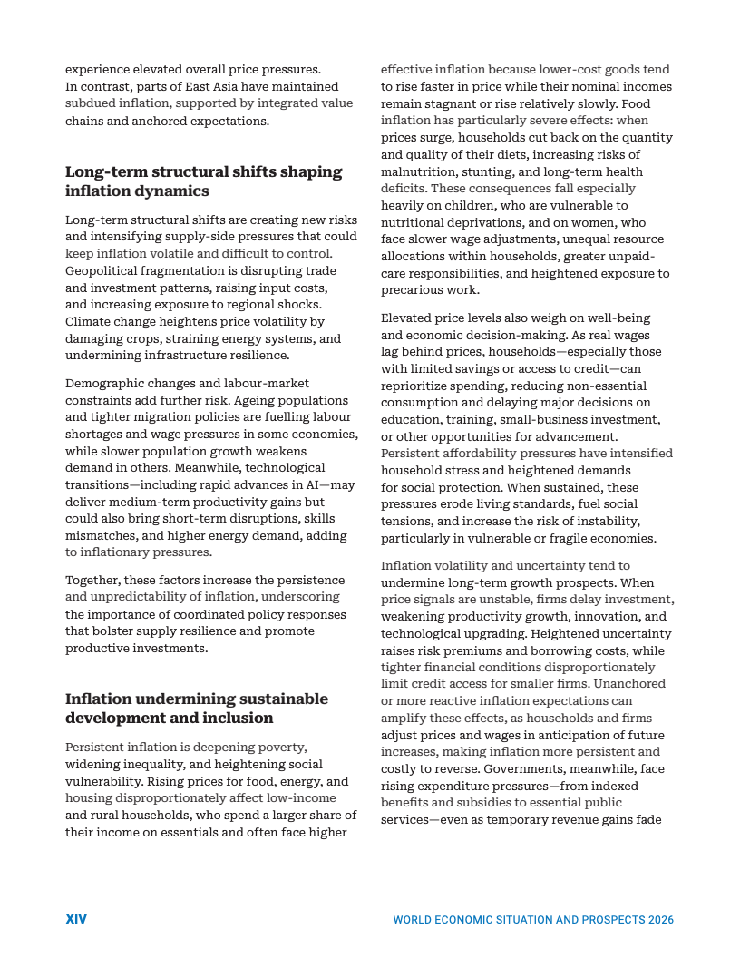 从需求结构看,全球增长更多依赖消费而非投资。报告强调,受融资成本偏高和政策不确定性影响,全球投资持续低迷,仅在部分发达经济体中,人工智能相关投资形成局部亮点。相比之下,居民消费在货币政策逐步宽松和就业市场相对稳定的支撑下保持韧性,但这种支撑呈现明显的区域分化特征,难以形成全球范围的同步拉动效应 。