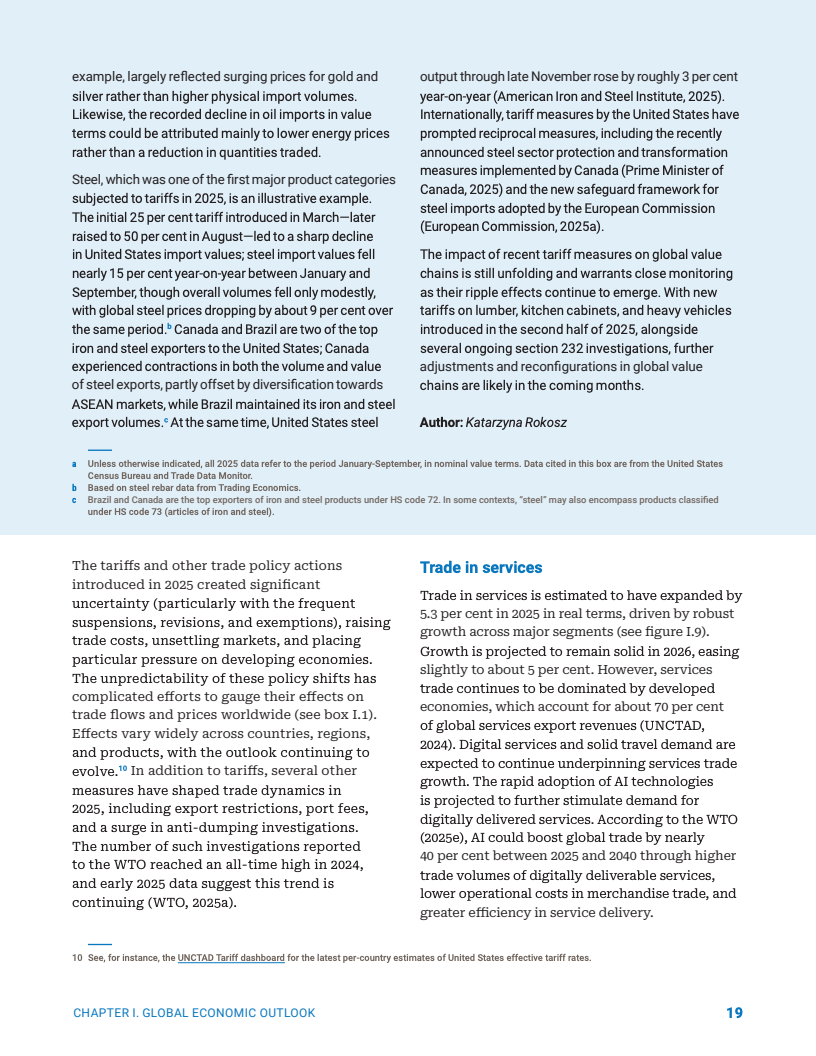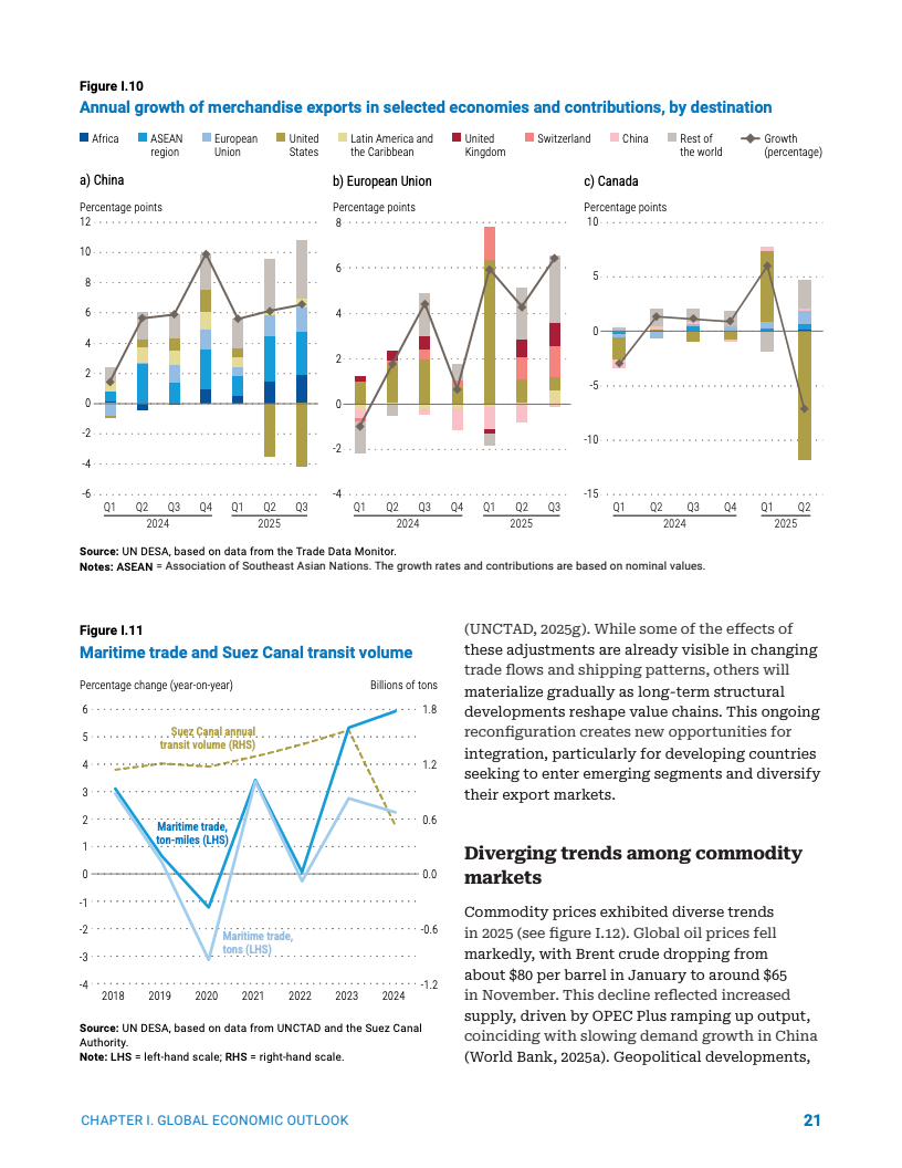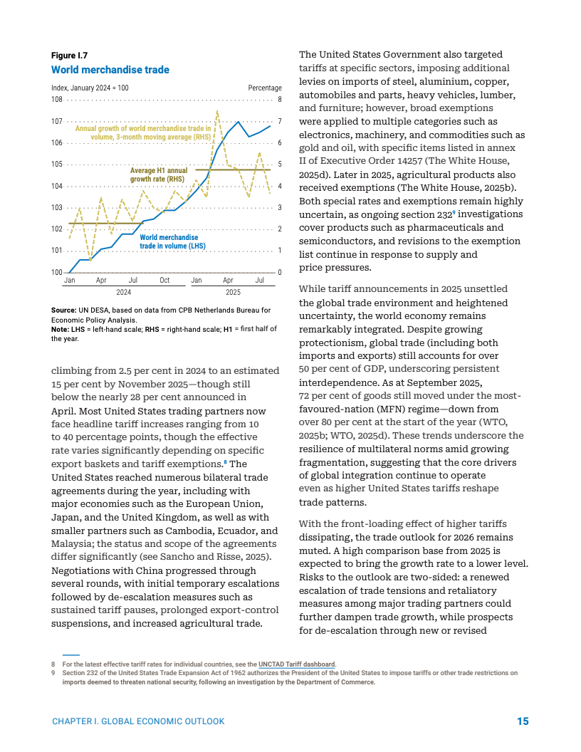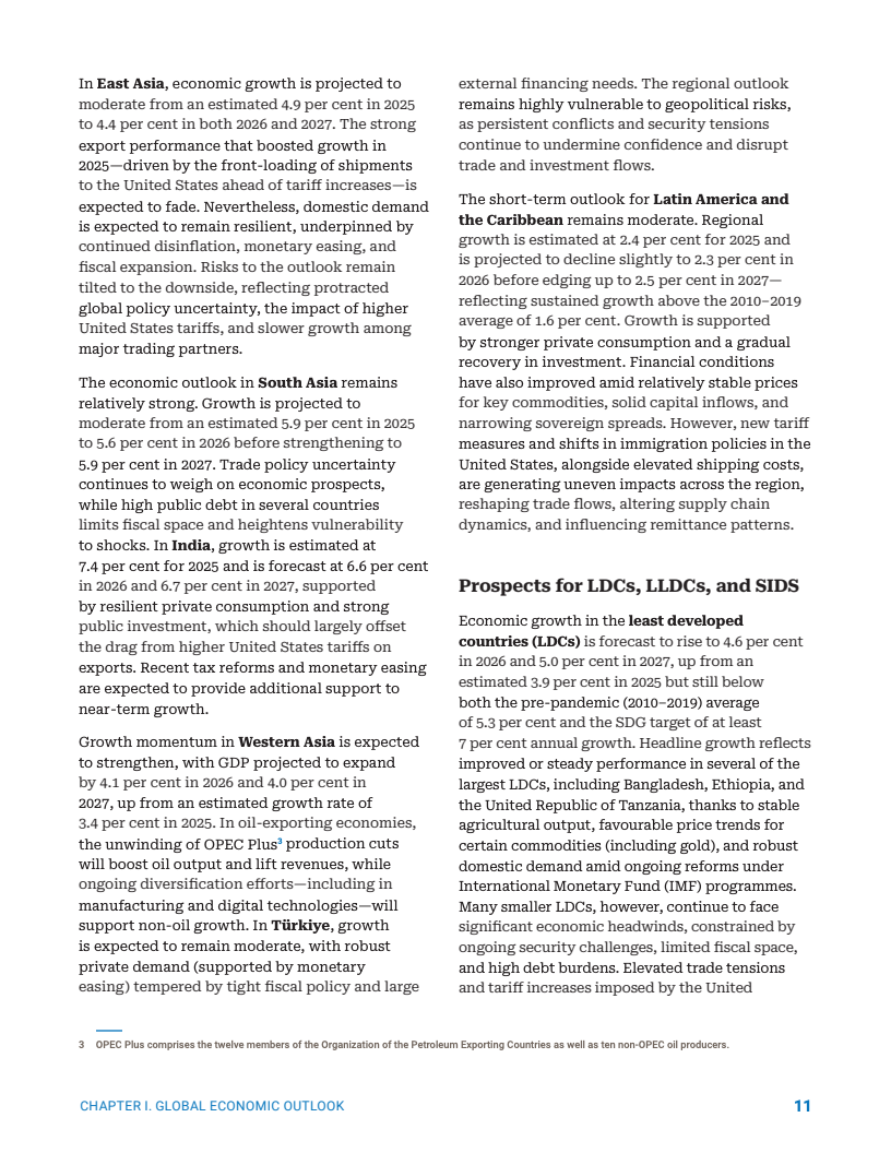 全球经济在高度不确定性中维持低位稳定增长。报告指出,2025年全球经济增速约为2.8%,2026年预计小幅回落至2.7%,2027年有望回升至2.9%。这一轨迹反映出在地缘政治紧张、贸易政策反复以及财政空间受限的背景下,全球经济韧性仍在,但动能不足已成为中期常态。美国在2025年上调关税虽未引发全面贸易冲突,但已对全球贸易信心和投资预期形成持续压制 。
