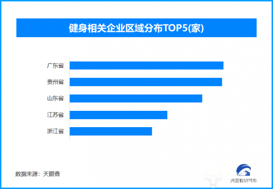 从区域分布来看,广东省、贵州省、山东省健身相关企业数量位居前列,分别为超16.8万余家、16.6万余家和14.5万余家。排在其后的是江苏省和浙江省。