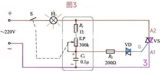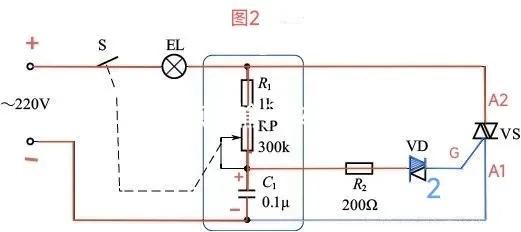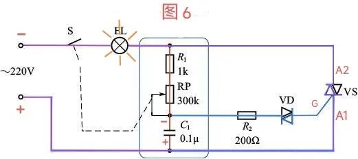 过0点后,进入220V的负半周,负半周为图示中的上负下正。电流分两路,其中一路加在VS双向可控硅的A1端,此时,VS双向可控硅处于截止状态;另一路经电容C1、RP、R1、灯泡、开关S回到220V的电源负构成电流回路,给C1电容充电,C1上充得下正上负的电压。