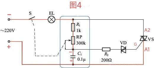 3. VS双向可控硅的A2、A1端导通后,220V的正通过开关S、灯泡、VS回到220V的负形成灯泡供电电流回路,灯泡点亮发光至A2、A1端导通电压过0点。同时,C1上的电压通过R2、VD双向触发二极管、VS双向可控硅的G极、A1、电容负极持续放电,至放电完成。