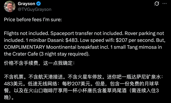 评论区的网友毫不留情地说,这看起来就是个玩笑。还有网友若无其事地,认真列出各项价格表,实际上每一行都在阴阳怪气地吐槽,太空旅游太离谱,明显就是割韭菜。