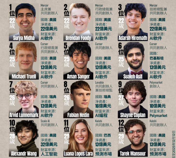 前段时间,福布斯统计了全球 30 岁以下白手起家的富豪榜,其中来自 AI 编程工具 Cursor 的联合创始人就有 4 位,净资产都来到了 13 亿美元;还有 Lovable 的创始人,26 岁,净资产 16 亿美元;以及这段时间备受关注的 Meta AI 实验室老大,曾经是 Scale AI 的 CEO Alexandr Wang。