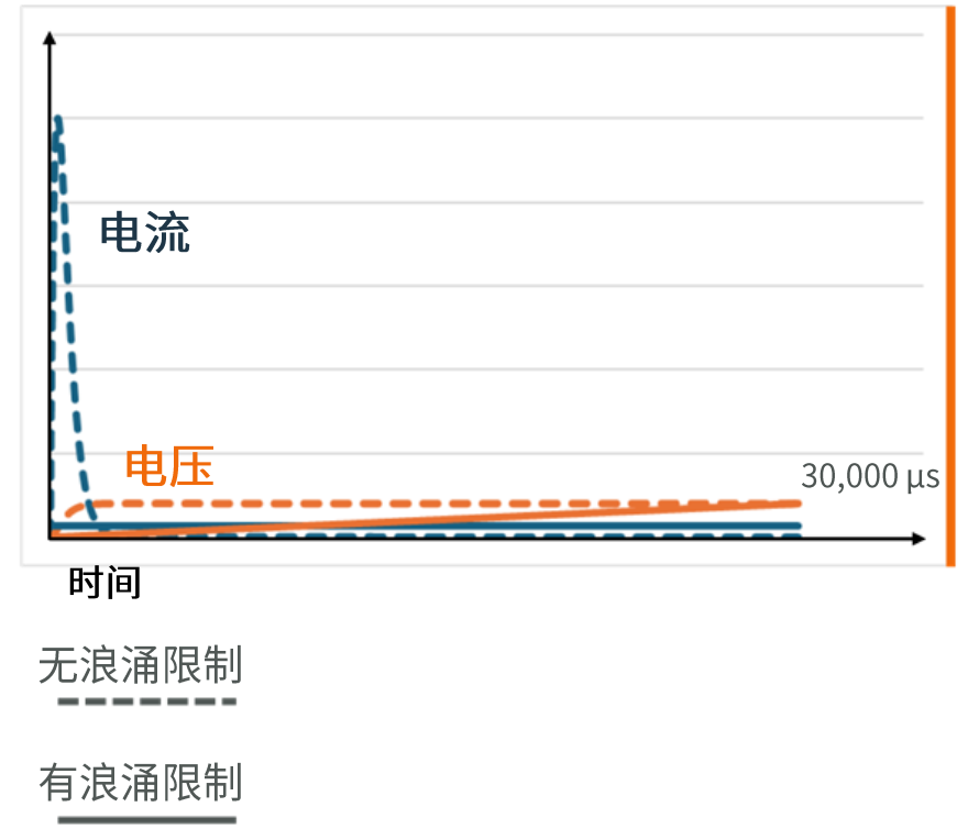 右图将充电时间范围从最初的 30 µs 延长至约 30,000 µs 。 虚线代表无浪涌电流限制的电流和电压水平;实线代表有电流限制的电压和电流水平。