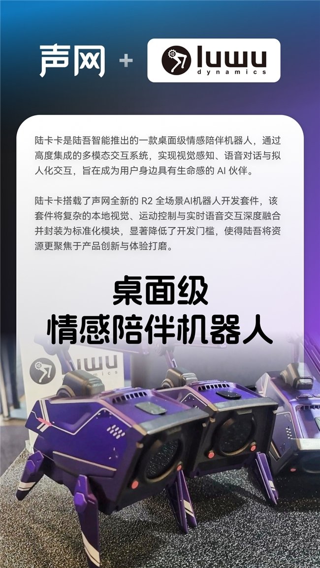 陆卡卡搭载了声网全新的 R2全场景AI机器人开发套件,该套件将复杂的本地视觉、运动控制与实时语音交互深度融合并封装为标准化模块,显著降低了开发门槛,使得陆吾将资源更聚焦于产品创新与体验打磨。
