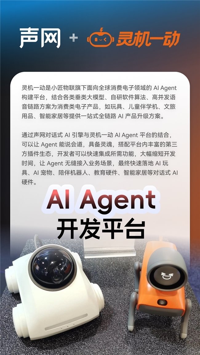 通过声网对话式 AI 引擎与灵机一动AI Agent 平台的结合,可以让 Agent 能说会道,具备灵魂,搭配平台内丰富的第三方插件生态,开发者可以快速集成所需功能,大幅缩短开发时间,让 Agent 无缝接入业务场景,最终快速落地AI 玩具、AI 宠物、陪伴机器人、教育硬件、智能家居等对话式 AI 硬件。