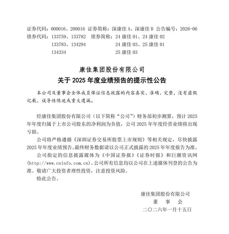 与高管变动公告相近,康佳集团同时披露了2025年年度业绩预警信息,经公司财务部初步测算,预计2025年年度归属于上市公司股东的净利润为负值,全年经营业绩将出现亏损。公司表示,将严格遵循《深圳证券交易所股票上市规则》相关规定,尽快披露2025年年度业绩预告,最终财务数据以正式披露的年度报告为准。