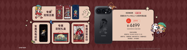 荣耀500 Pro MOLLY 20周年限定版预售即刻开启,并将于1月25日10点08分在荣耀商城等全渠道正式开售。同时,荣耀还将自1月23日起,在北京、上海等全国多座城市陆续开展线下主题店与快闪活动,为粉丝提供近距离体验机会。