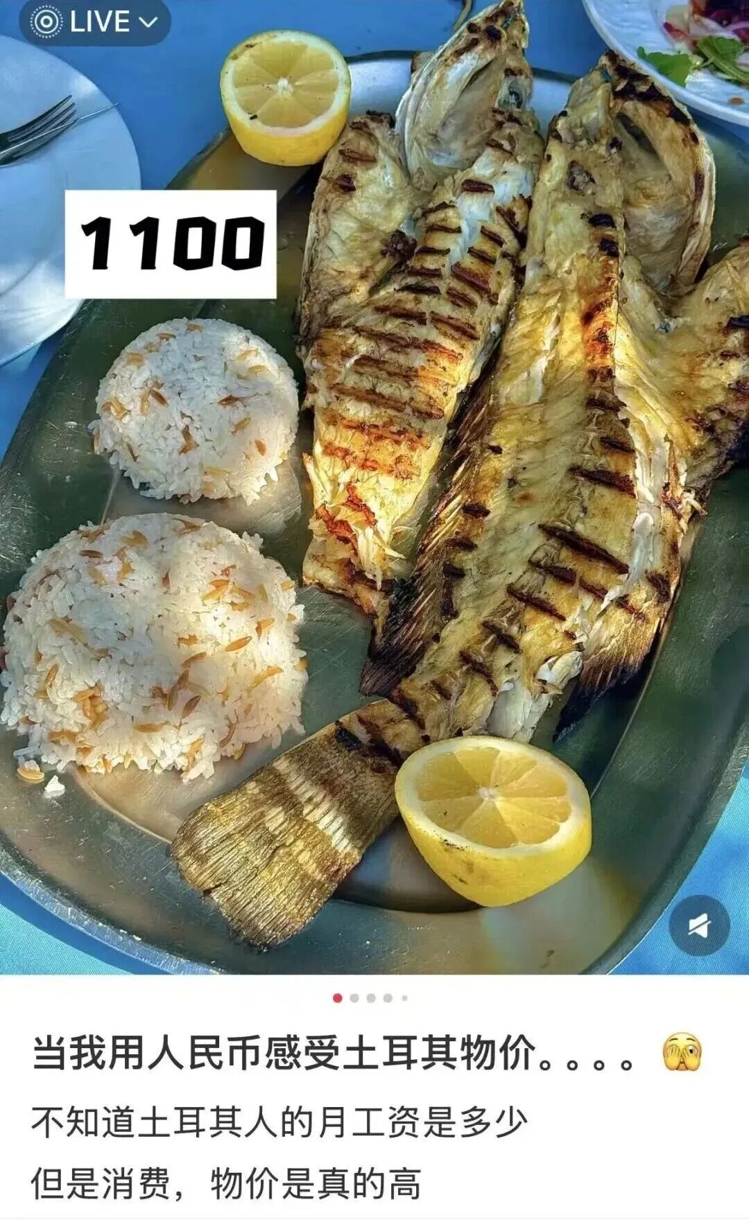 1100人民币,在土耳其可以尊享两条烤鱼和两份米饭。