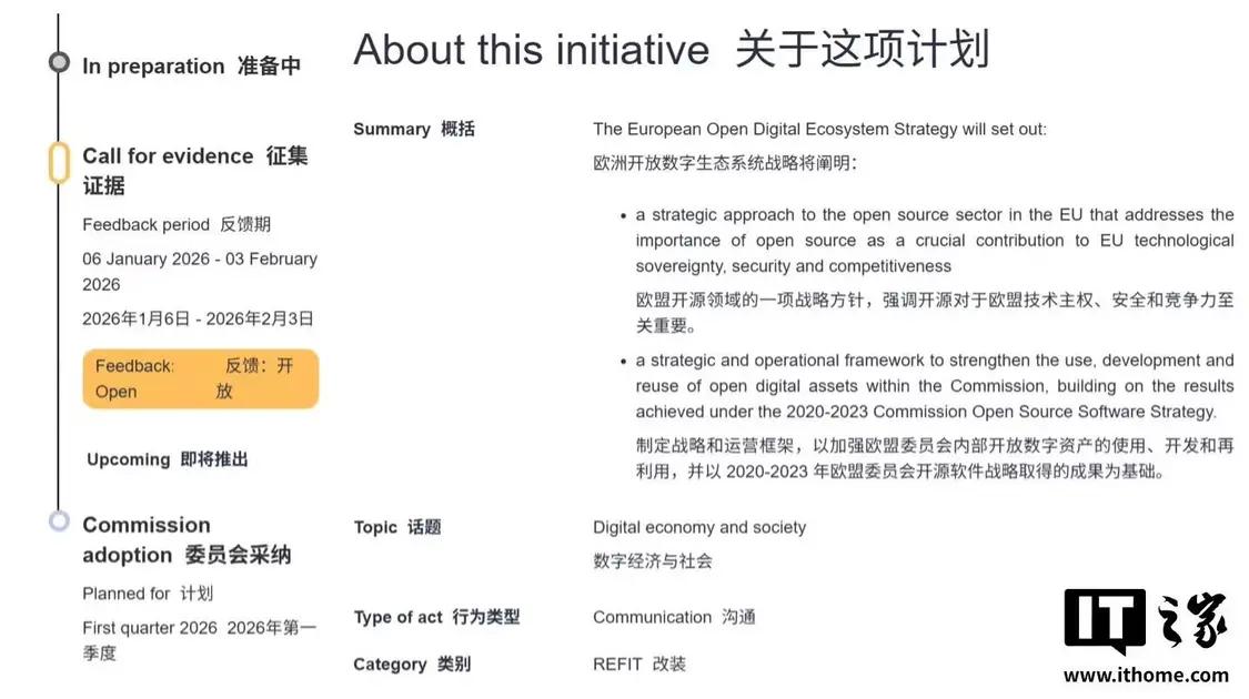 为深化这一战略,欧盟委员会已启动关于“欧洲开放数字生态系统”的公众咨询,截止日期为 2026 年 2 月 3 日。该咨询旨在通过引入开源资产来提升欧洲的技术主权与竞争力。IT之家附上相关截图如下: