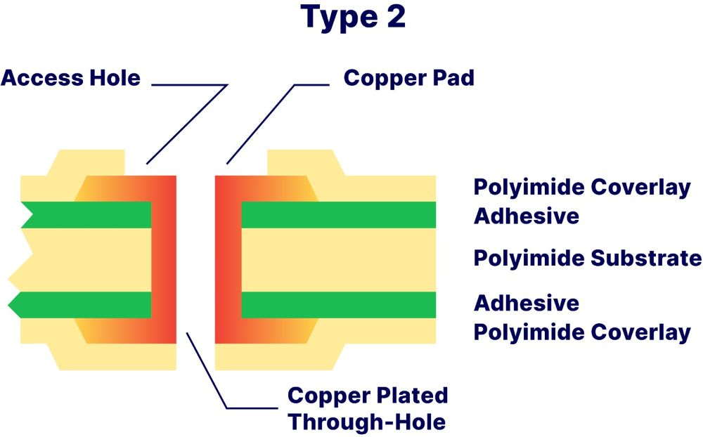2 类:双面柔性印制板,包含两层导电层,带有金属化过孔,可带或不带加强板。