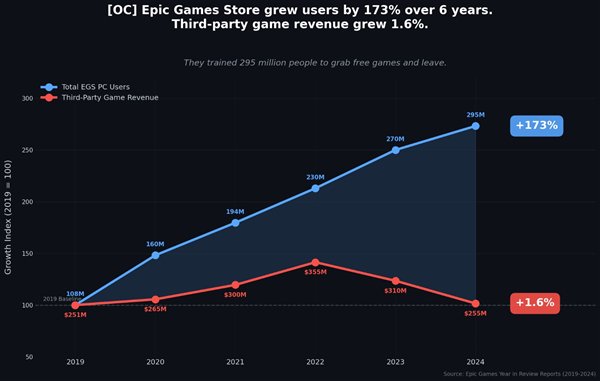 据报道,Epic Games的用户数从2019年的1.08亿人,增长到了2024年的2.95亿人,增长了173%。