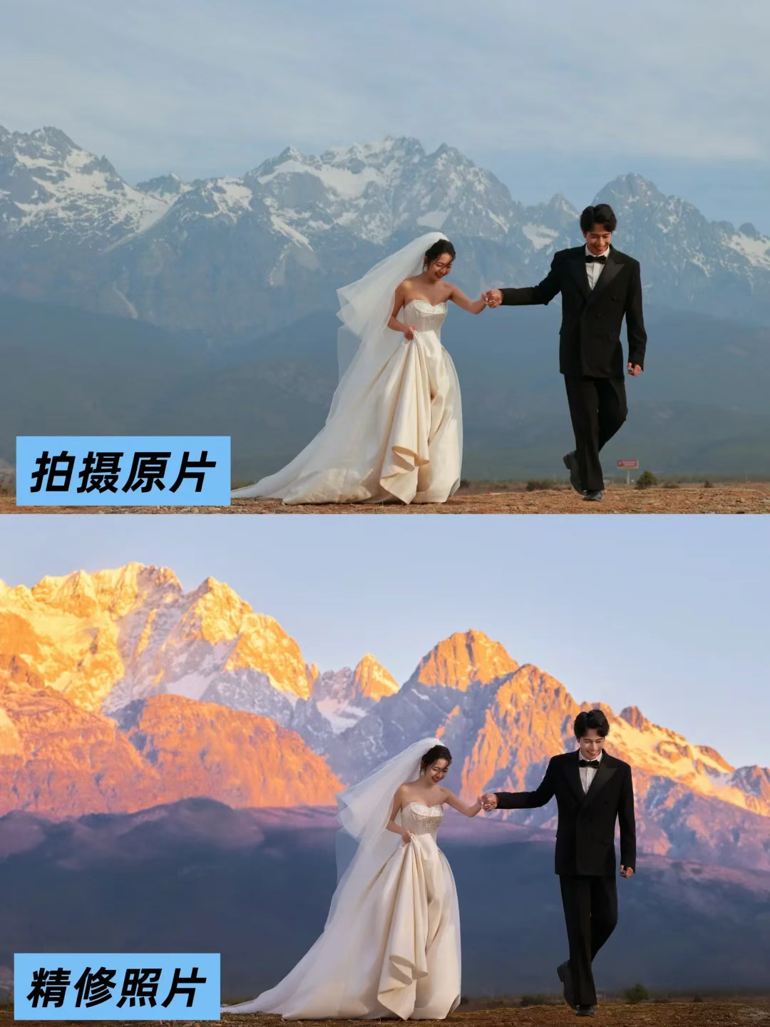 更讽刺的是后期修图,无论天气好坏都能拍,乌云能P掉,普通雪山能修成“日照金山”,这种标准化操作,最终交付的照片千篇一律,毫无记忆点。