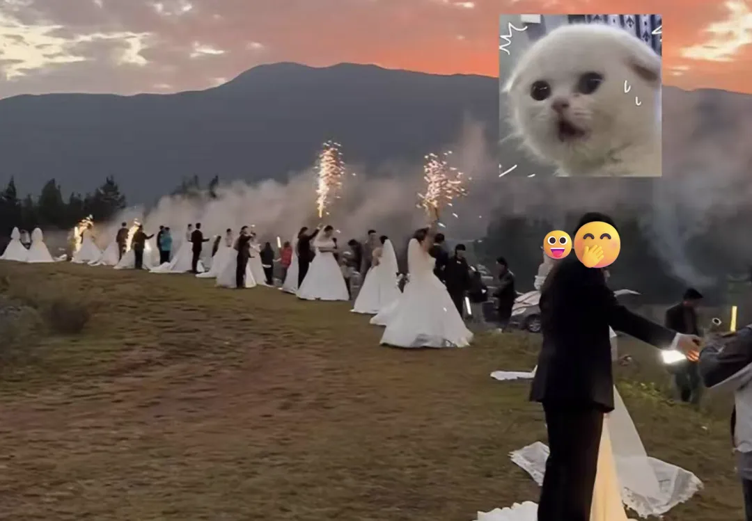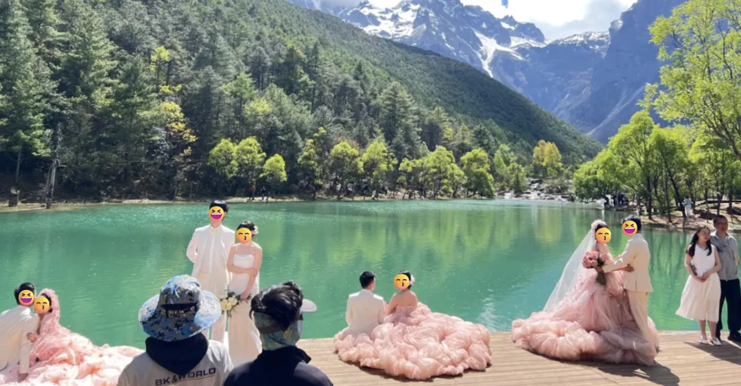 玉龙雪山脚下,每隔两米就有一对新人摆着同款姿势、念着相同誓词,热门机位常年大排长龙,有商家分享,以前来雪山旅拍的客户最多一天也就150对,近两年平均每天都有500多对。