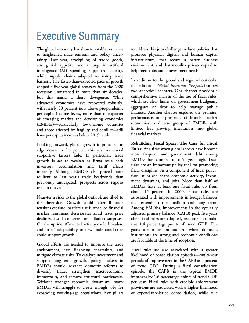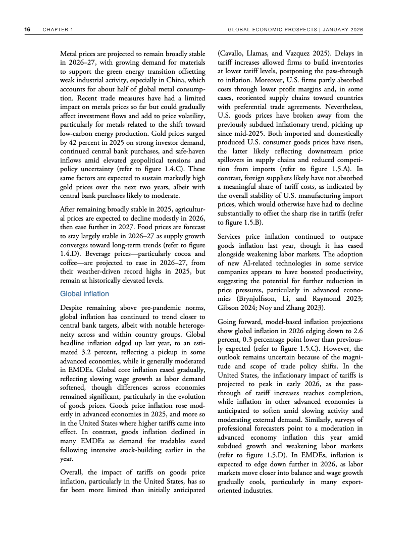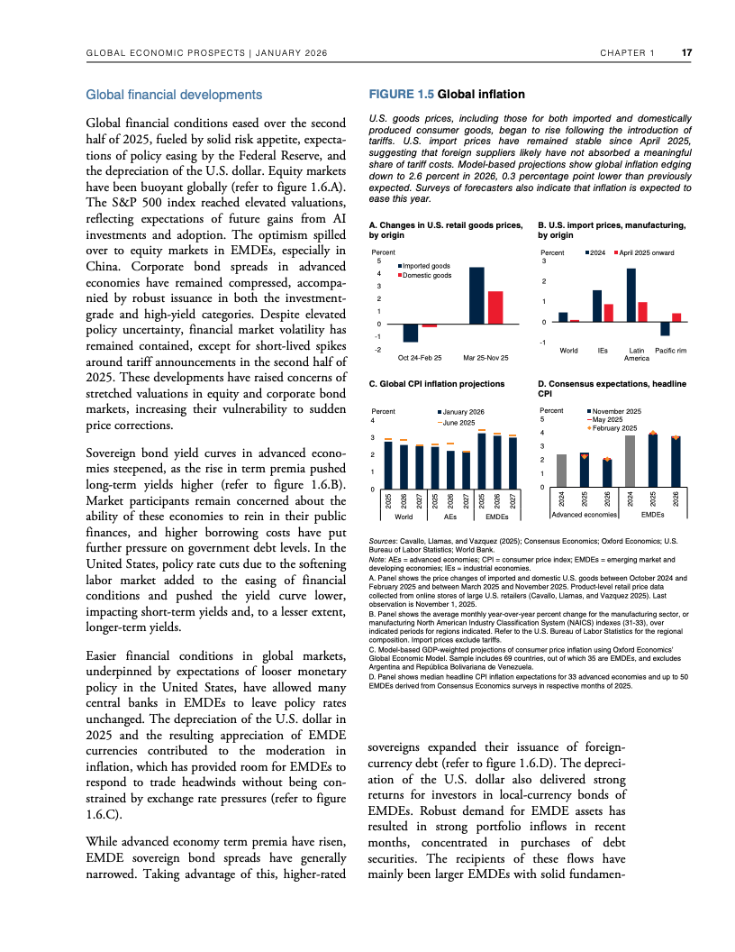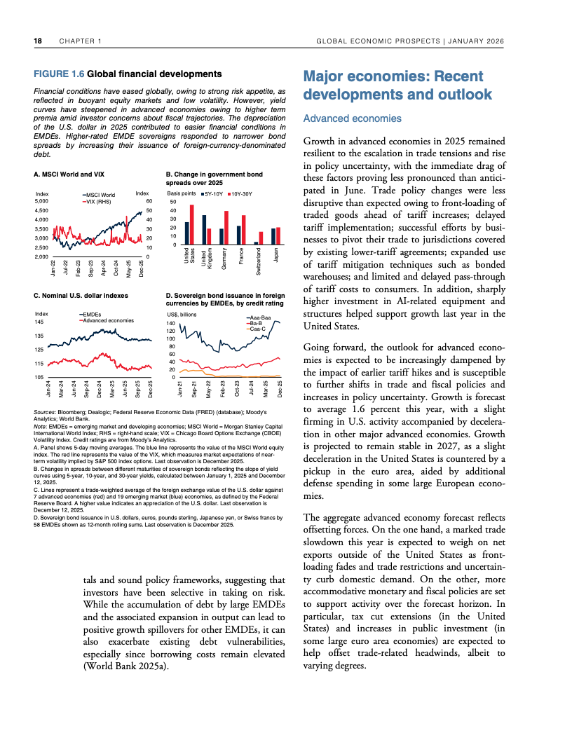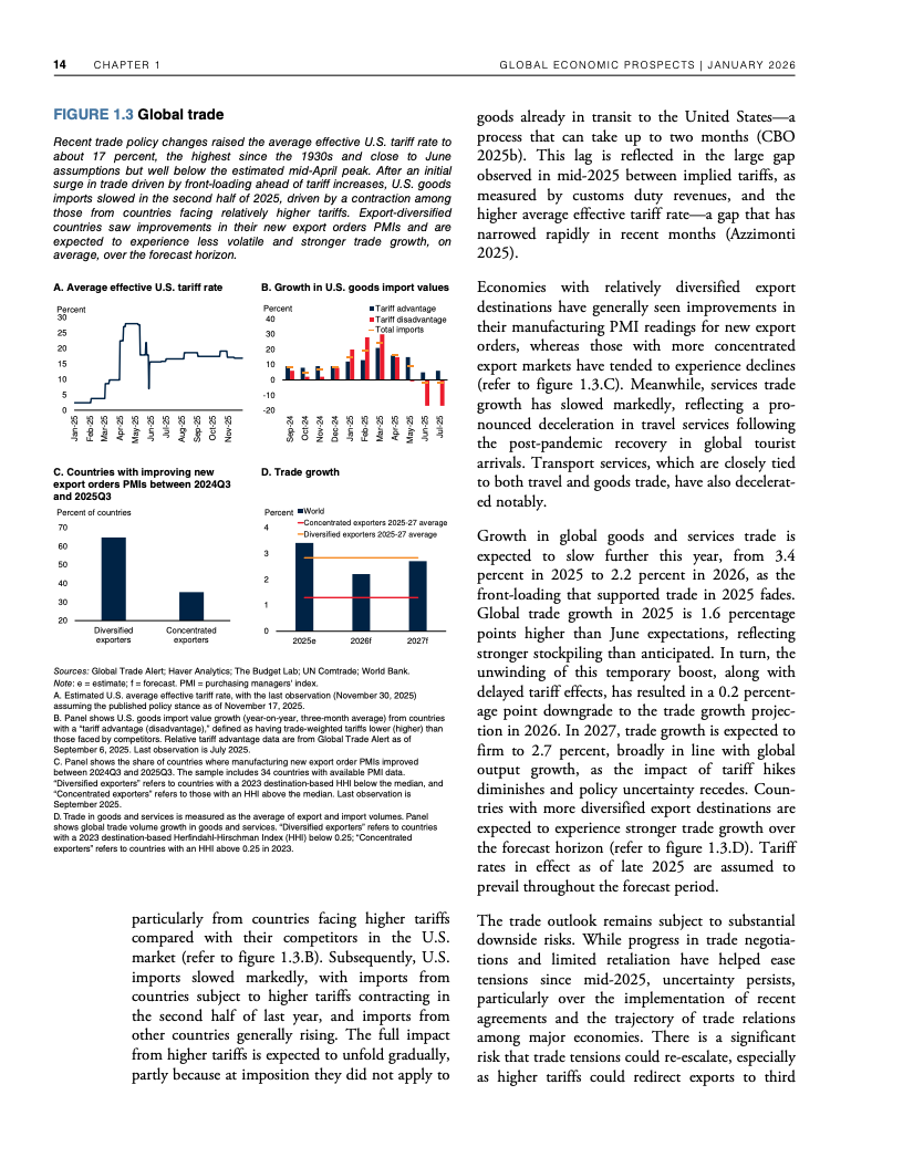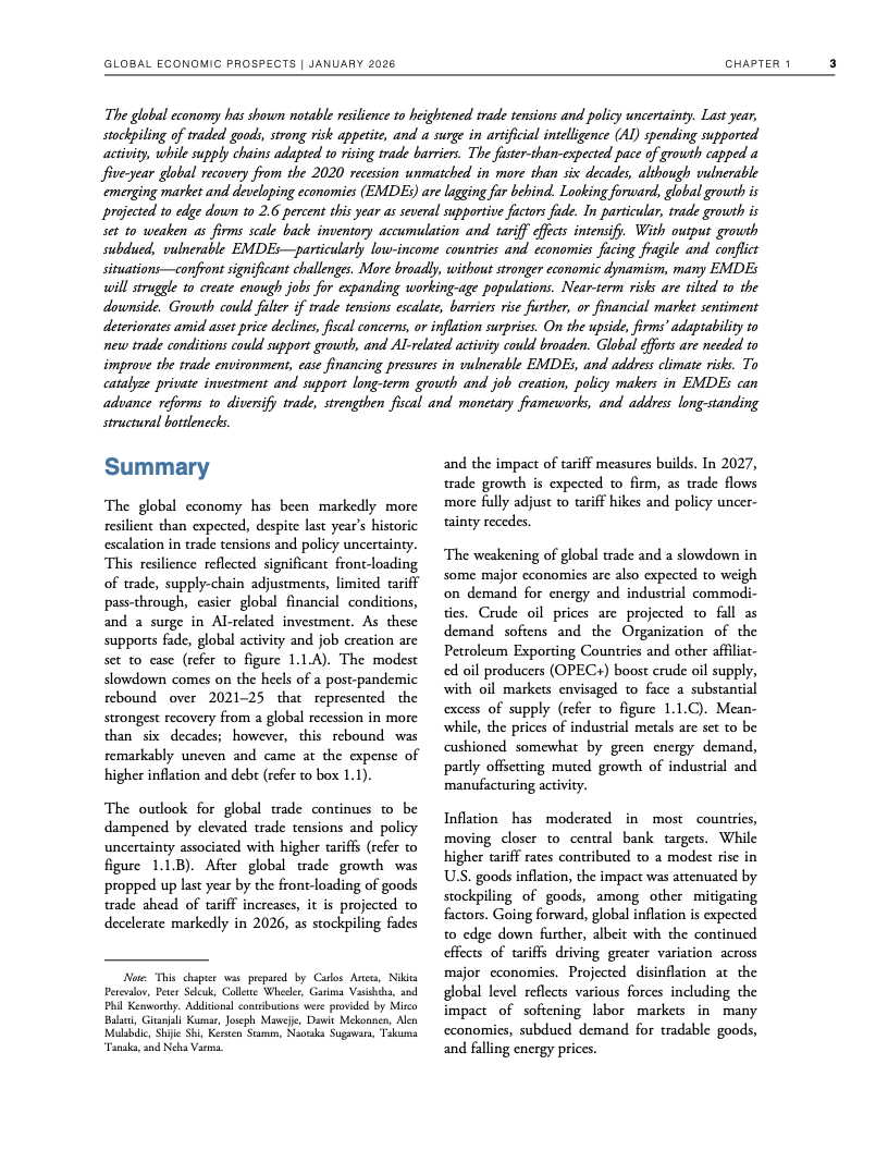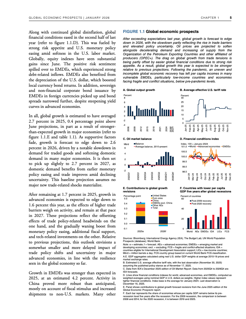 全球经济在高贸易摩擦与政策不确定性并存的背景下展现出超预期韧性。世界银行数据显示,2025年全球GDP增速预计为2.7%,与一年前预测基本一致,并在2026年小幅放缓至2.6%。这一表现得益于企业提前囤货、供应链重构、金融条件阶段性宽松以及人工智能相关投资的快速扩张,但这些支撑因素正在逐步减弱 。