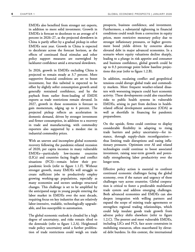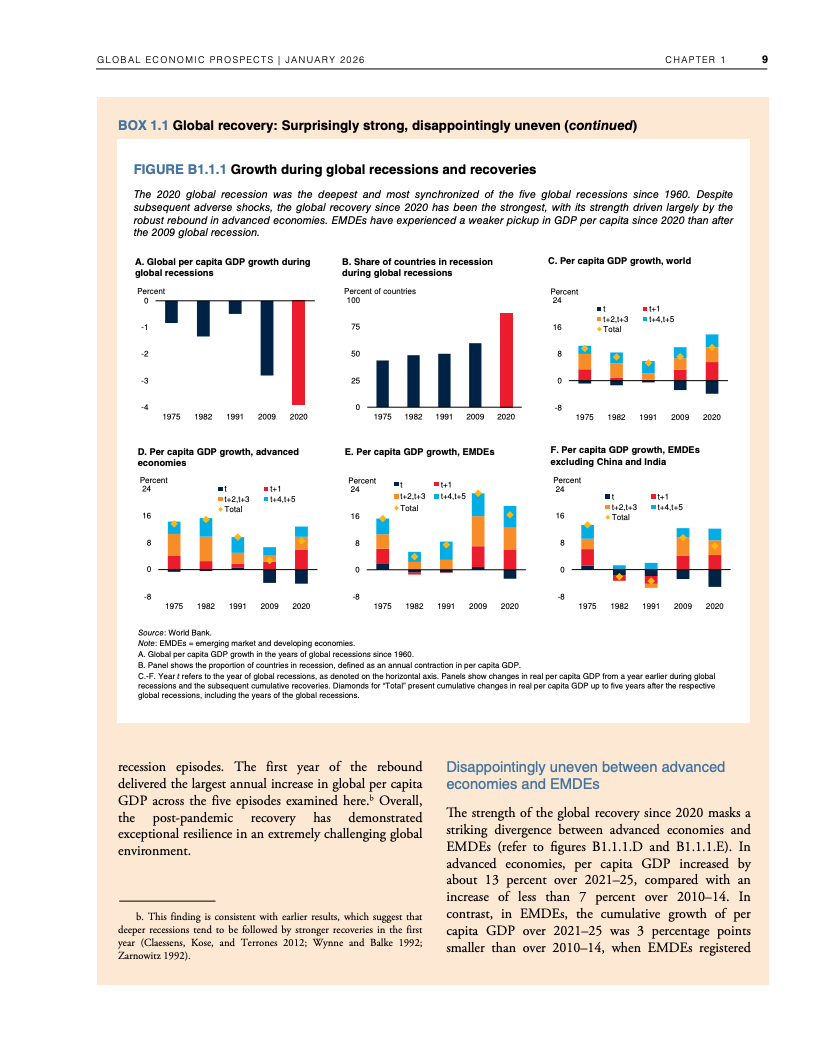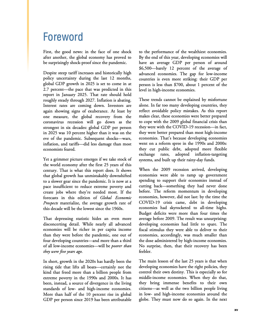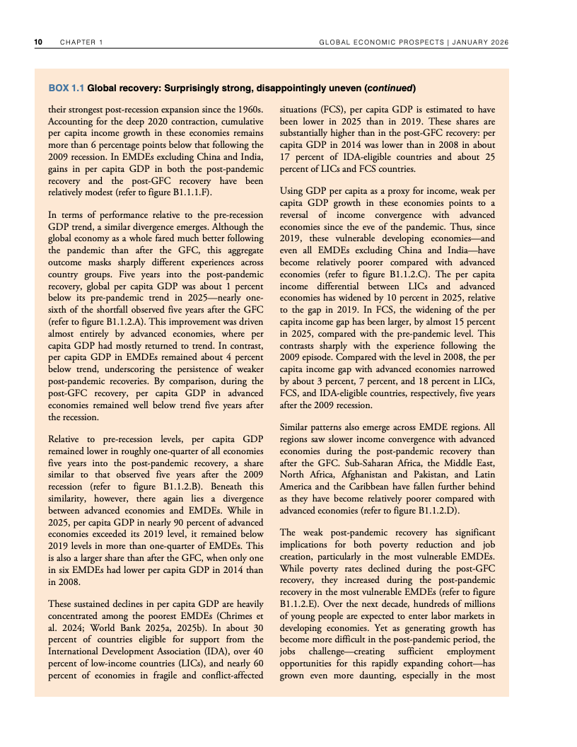 从长期视角看,韧性之下隐藏着明显的结构性下行。若预测成立,2020年代全球平均增速将创下20世纪60年代以来最低水平。尽管2025年全球人均GDP较2019年高出约10%,但增长高度集中于高收入经济体,发展中经济体的人均收入恢复明显滞后,全球增长的“包容性”显著下降 。