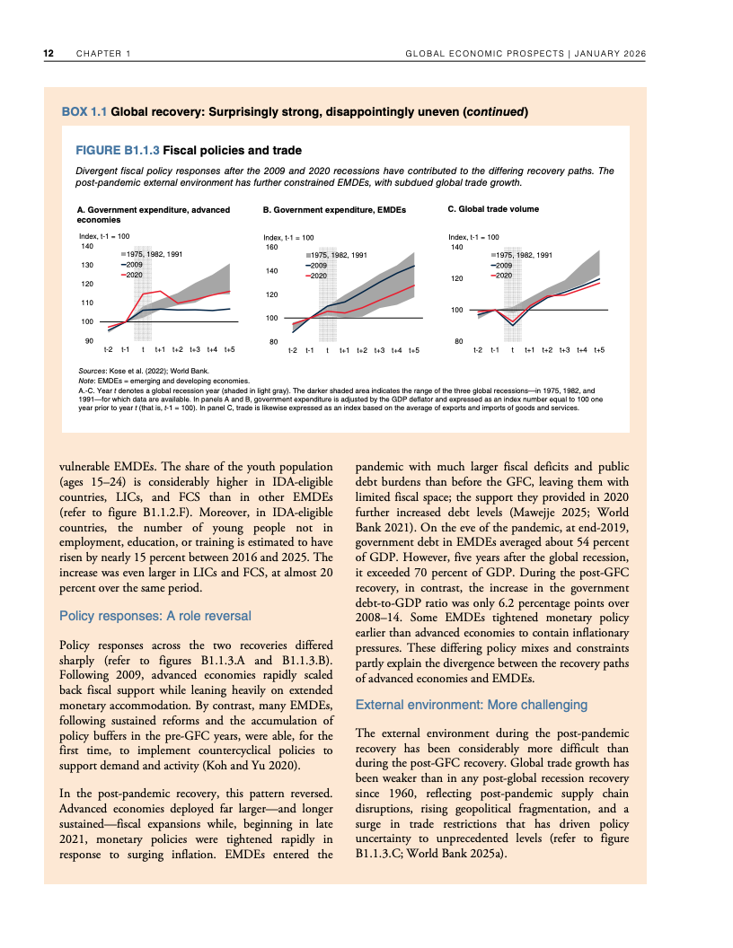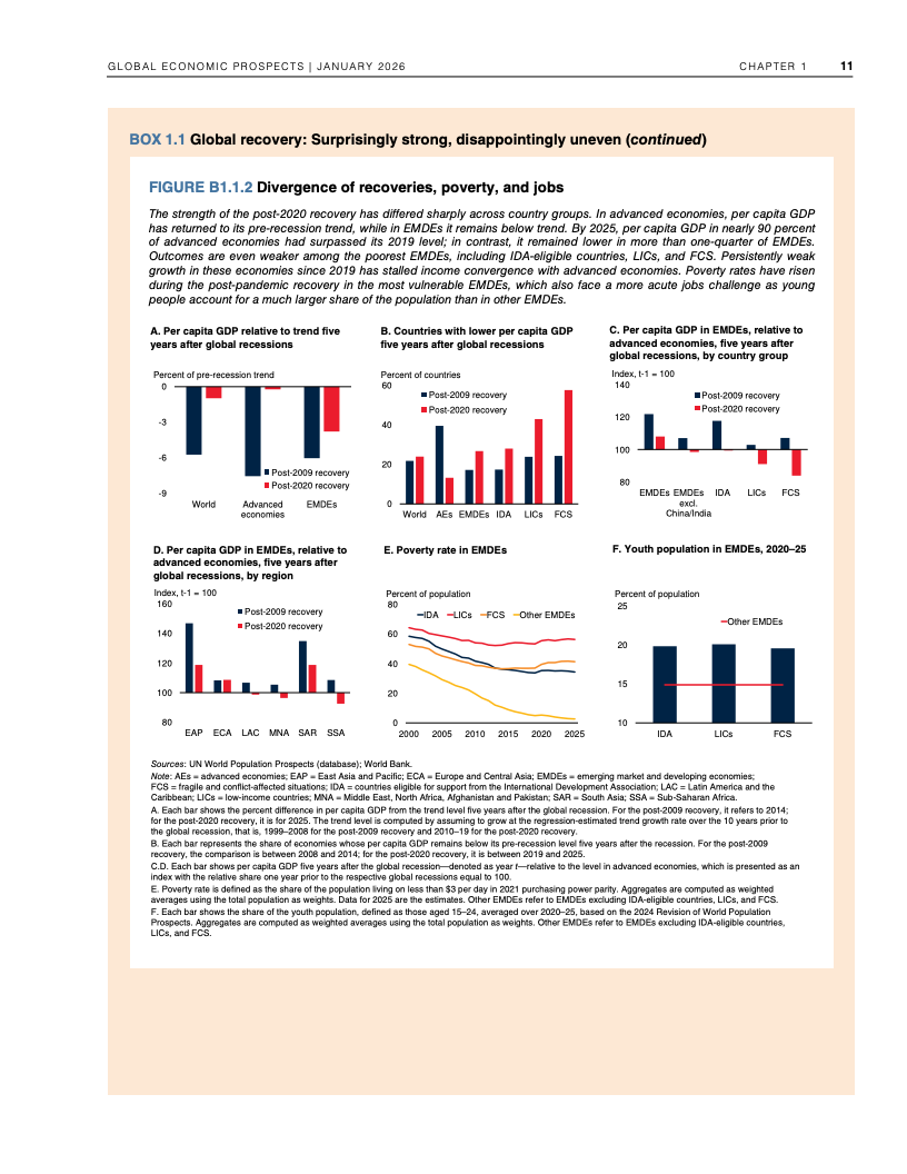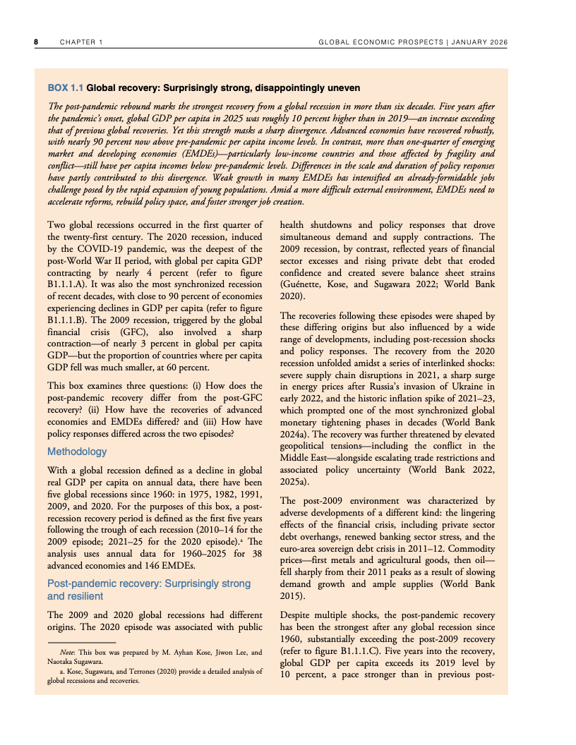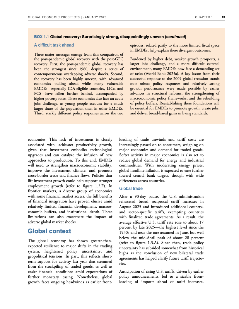 从长期视角看,韧性之下隐藏着明显的结构性下行。若预测成立,2020年代全球平均增速将创下20世纪60年代以来最低水平。尽管2025年全球人均GDP较2019年高出约10%,但增长高度集中于高收入经济体,发展中经济体的人均收入恢复明显滞后,全球增长的“包容性”显著下降 。