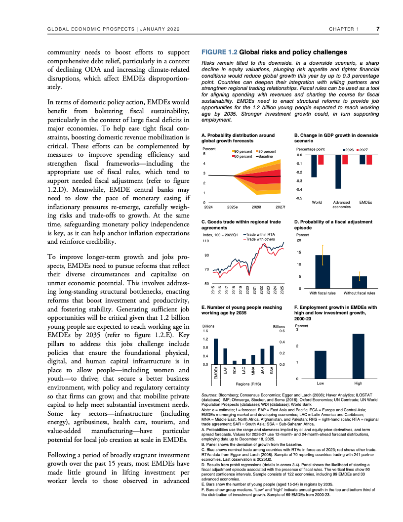 风险层面,贸易摩擦升级、金融市场剧烈调整及地缘冲突仍偏向下行情景。世界银行测算,若全球风险偏好显著下降,2026年全球增速可能比基准情景低0.3个百分点。同时,发展中经济体债务水平处于55年高位,财政空间持续收缩 。